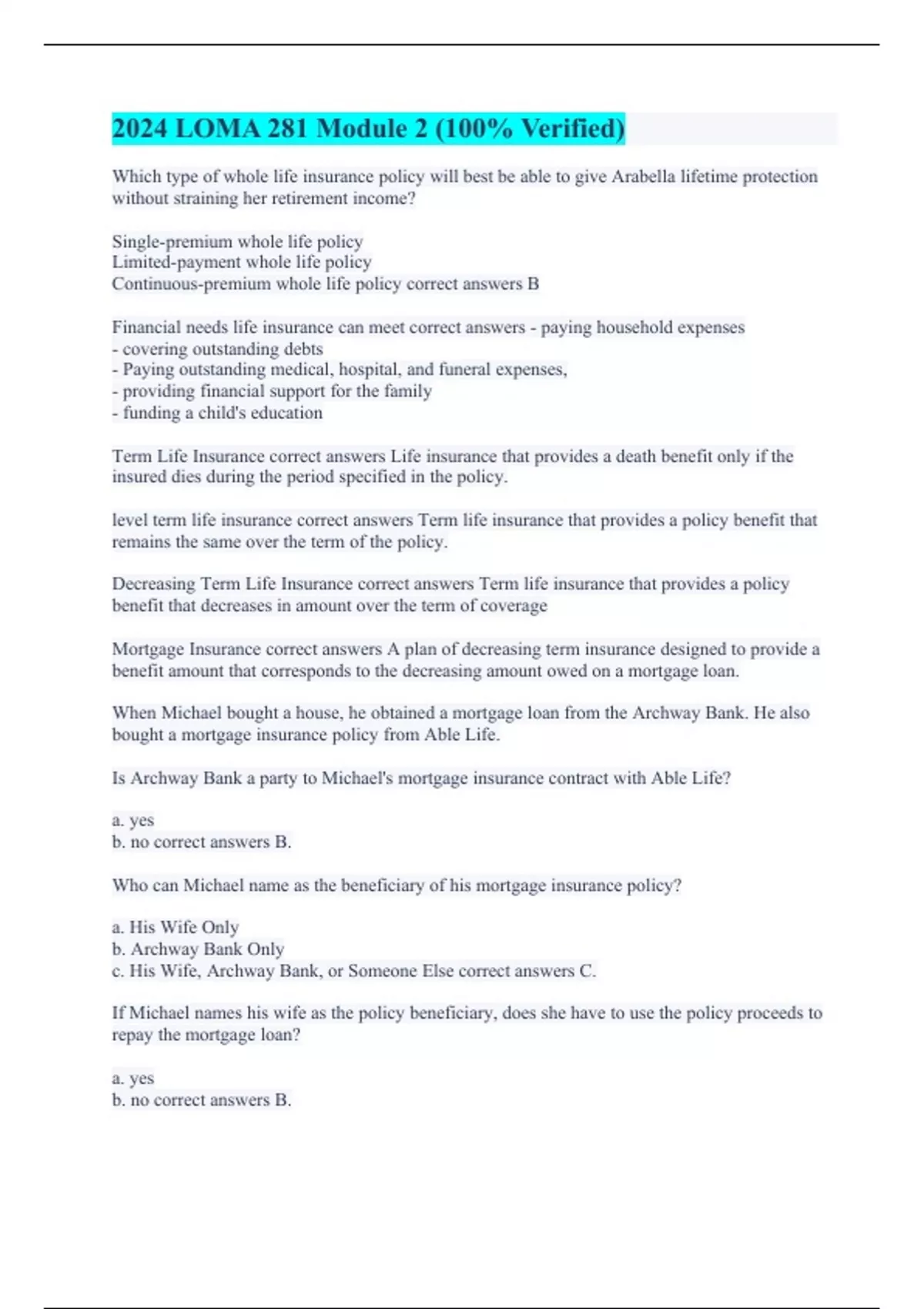 Which type of whole life insurance policy will best be able to give Arabella lifetime protection without straining her retirement income? Single-premium whole life policy Limited-payment whole life policy Continuous-premium whole life policy correct answers B Financial needs life insurance can meet correct answers - paying household expenses - covering outstanding debts - Paying outstanding medical, hospital, and funeral expenses, - providing financial support for the family - funding a child's education Term Life Insurance correct answers Life insurance that provides a death benefit only if the insured dies during the period specified in the policy. level term life insurance correct answers Term life insurance that provides a policy benefit that remains the same over the term of the policy. Decreasing Term Life Insurance correct answers Term life insurance that provides a policy benefit that decreases in amount over the term of coverage Mortgage Insurance correct answers A plan of decreasing term insurance designed to provide a benefit amount that corresponds to the decreasing amount owed on a mortgage loan. When Michael bought a house, he obtained a mortgage loan from the Archway Bank. He also bought a mortgage insurance policy from Able Life. Is Archway Bank a party to Michael's mortgage insurance contract with Able Life? a. yes b. no correct answers B. Who can Michael name as the beneficiary of his mortgage insurance policy? a. His Wife Only b. Archway Bank Only c. His Wife, Archway Bank, or Someone Else correct answers C. If Michael names his wife as the policy beneficiary, does she have to use the policy proceeds to repay the mortgage loan? a. yes b. no correct answers B.