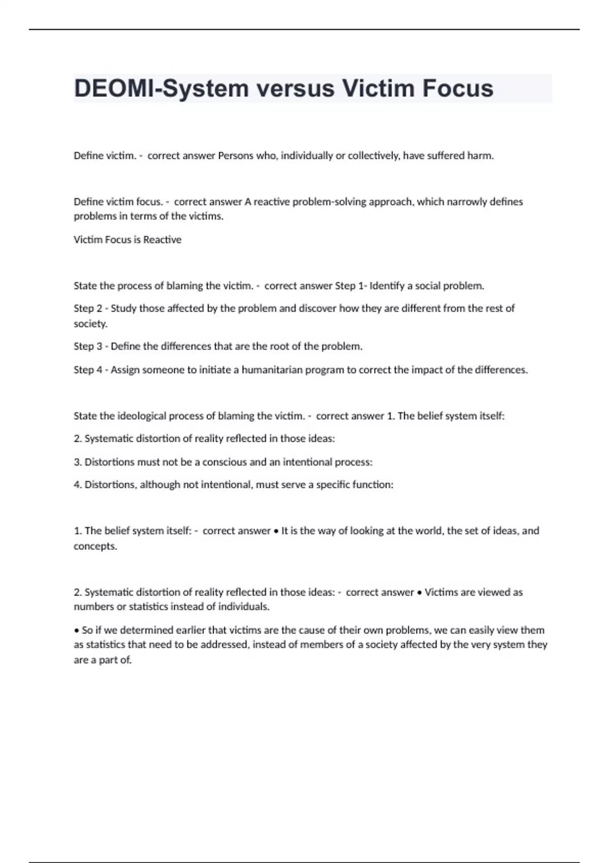 DEOMI-System versus Victim Focus Define victim. - correct answer Persons who, individually or collectively, have suffered harm. Define victim focus. - correct answer A reactive problem-solving approach, which narrowly defines problems in terms of the victims. Victim Focus is Reactive State the process of blaming the victim. - correct answer Step 1- Identify a social problem. Step 2 - Study those affected by the problem and discover how they are different from the rest of society. Step 3 - Define the differences that are the root of the problem. Step 4 - Assign someone to initiate a humanitarian program to correct the impact of the differences. State the ideological process of blaming the victim. - correct answer 1. The belief system itself: 2. Systematic distortion of reality reflected in those ideas: 3. Distortions must not be a conscious and an intentional process: 4. Distortions, although not intentional, must serve a specific function: 1. The belief system itself: - correct answer • It is the way of looking at the world, the set of ideas, and concepts. 2. Systematic distortion of reality reflected in those ideas: - correct answer • Victims are viewed as numbers or statistics instead of individuals. • So if we determined earlier that victims are the cause of their own problems, we can easily view them as statistics that need to be addressed, instead of members of a society affected by the very system they are a part of.
