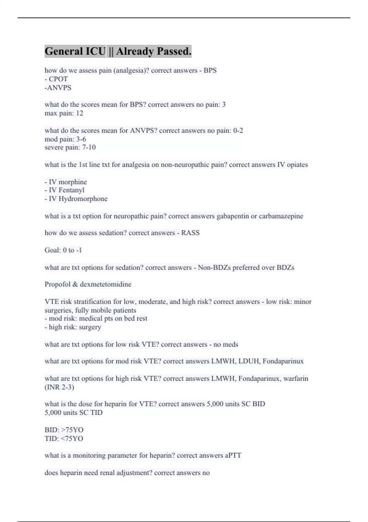 how do we assess pain (analgesia)? correct answers - BPS - CPOT -ANVPS what do the scores mean for BPS? correct answers no pain: 3 max pain: 12 what do the scores mean for ANVPS? correct answers no pain: 0-2 mod pain: 3-6 severe pain: 7-10 what is the 1st line txt for analgesia on non-neuropathic pain? correct answers IV opiates - IV morphine - IV Fentanyl - IV Hydromorphone what is a txt option for neuropathic pain? correct answers gabapentin or carbamazepine how do we assess sedation? correct answers - RASS Goal: 0 to -1 what are txt options for sedation? correct answers - Non-BDZs preferred over BDZs Propofol & dexmetetomidine VTE risk stratification for low, moderate, and high risk? correct answers - low risk: minor surgeries, fully mobile patients - mod risk: medical pts on bed rest - high risk: surgery what are txt options for low risk VTE? correct answers - no meds what are txt options for mod risk VTE? correct answers LMWH, LDUH, Fondaparinux what are txt options for high risk VTE? correct answers LMWH, Fondaparinux, warfarin (INR 2-3) what is the dose for heparin for VTE? correct answers 5,000 units SC BID 5,000 units SC TID BID: 75YO TID: 75YO what is a monitoring parameter for heparin? correct answers aPTT does heparin need renal adjustment? correct answers no