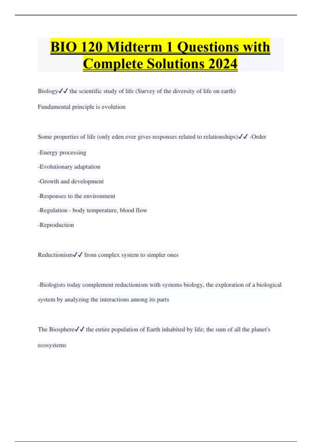 BIO 120 Midterm 1 Questions with Complete Solutions 2024 Biology the scientific study of life (Survey of the diversity of life on earth) Fundamental principle is evolution Some properties of life (only eden ever gives responses related to relationships) -Order -Energy processing -Evolutionary adaptation -Growth and development -Responses to the environment -Regulation - body temperature, blood flow -Reproduction Reductionism from complex system to simpler ones -Biologists today complement reductionism with systems biology, the exploration of a biological system by analyzing the interactions among its parts The Biosphere the entire population of Earth inhabited by life; the sum of all the planet's ecosystems