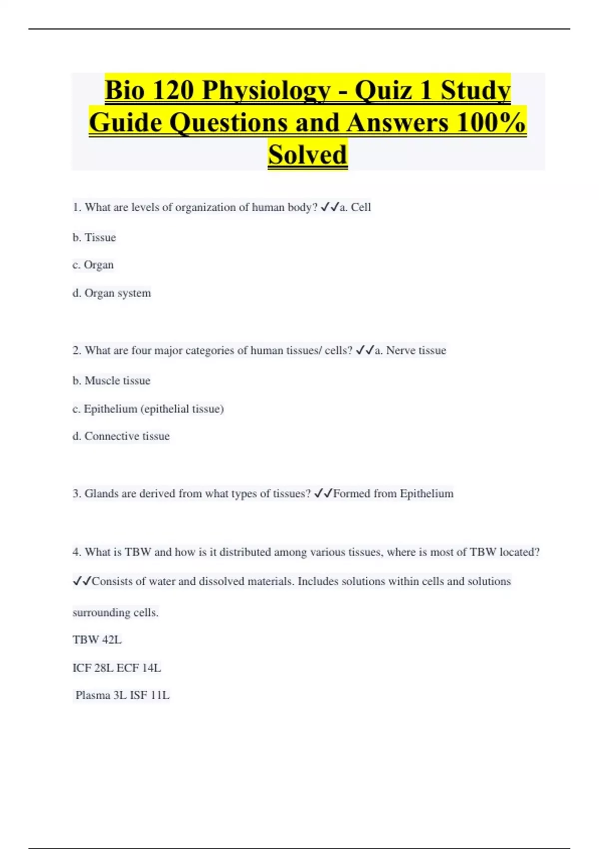 Bio 120 Physiology - Quiz 1 Study Guide Questions and Answers 100% Solved 1. What are levels of organization of human body? a. Cell b. Tissue c. Organ d. Organ system 2. What are four major categories of human tissues/ cells? a. Nerve tissue b. Muscle tissue c. Epithelium (epithelial tissue) d. Connective tissue 3. Glands are derived from what types of tissues? Formed from Epithelium 4. What is TBW and how is it distributed among various tissues, where is most of TBW located? Consists of water and dissolved materials. Includes solutions within cells and solutions surrounding cells. TBW 42L ICF 28L ECF 14L Plasma 3L ISF 11L