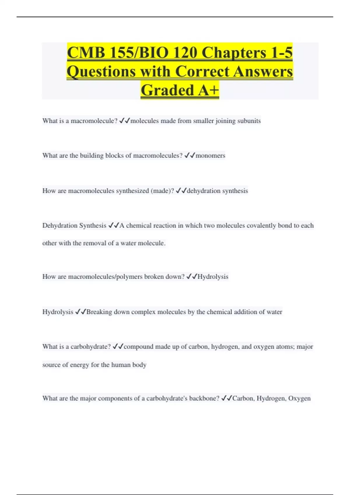 CMB 155/BIO 120 Chapters 1-5 Questions with Correct Answers Graded A+ What is a macromolecule? molecules made from smaller joining subunits What are the building blocks of macromolecules? monomers How are macromolecules synthesized (made)? dehydration synthesis Dehydration Synthesis A chemical reaction in which two molecules covalently bond to each other with the removal of a water molecule. How are macromolecules/polymers broken down? Hydrolysis Hydrolysis Breaking down complex molecules by the chemical addition of water What is a carbohydrate? compound made up of carbon, hydrogen, and oxygen atoms; major source of energy for the human body What are the major components of a carbohydrate's backbone? Carbon, Hydrogen, Oxygen