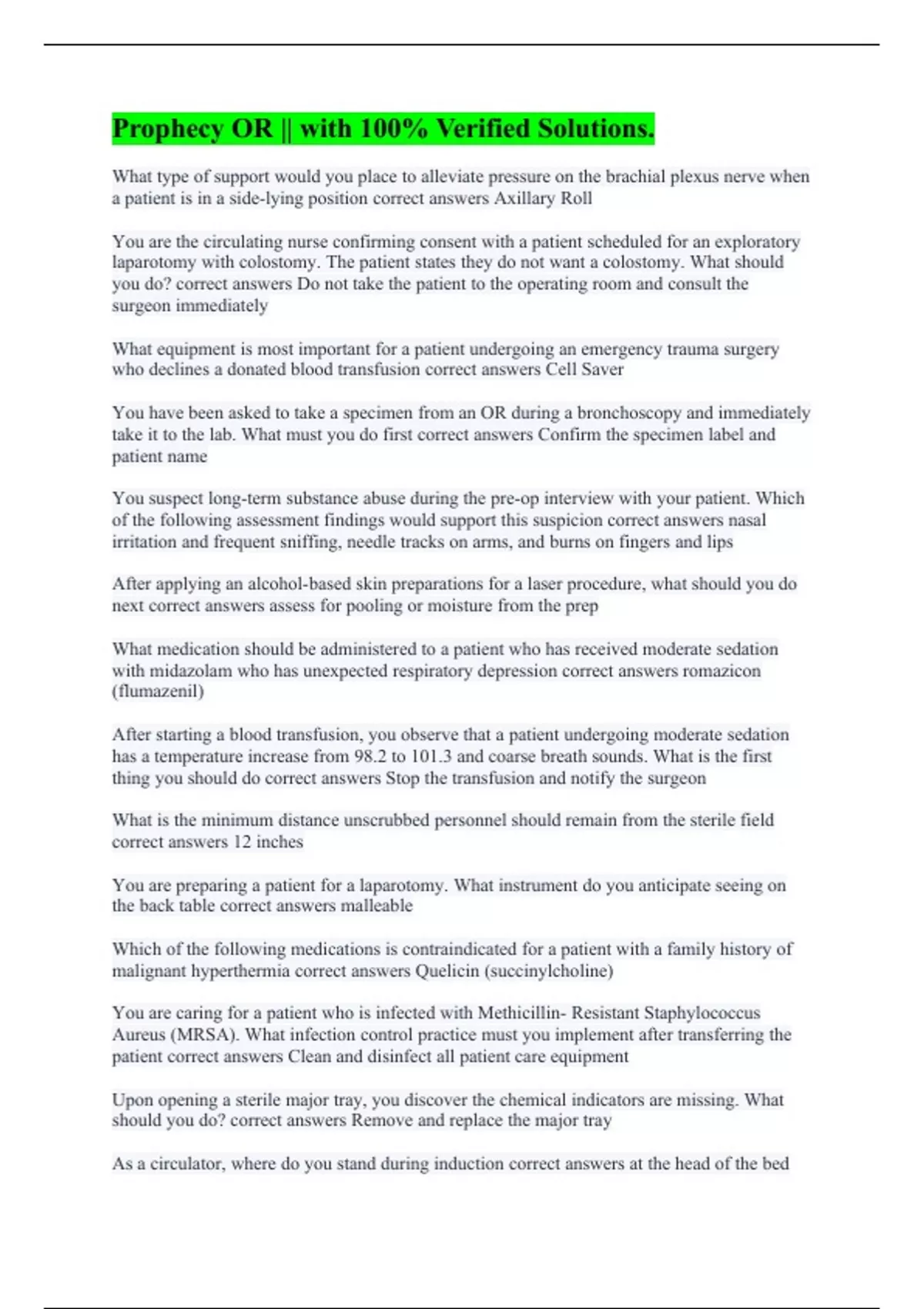What type of support would you place to alleviate pressure on the brachial plexus nerve when a patient is in a side-lying position correct answers Axillary Roll You are the circulating nurse confirming consent with a patient scheduled for an exploratory laparotomy with colostomy. The patient states they do not want a colostomy. What should you do? correct answers Do not take the patient to the operating room and consult the surgeon immediately What equipment is most important for a patient undergoing an emergency trauma surgery who declines a donated blood transfusion correct answers Cell Saver You have been asked to take a specimen from an OR during a bronchoscopy and immediately take it to the lab. What must you do first correct answers Confirm the specimen label and patient name You suspect long-term substance abuse during the pre-op interview with your patient. Which of the following assessment findings would support this suspicion correct answers nasal irritation and frequent sniffing, needle tracks on arms, and burns on fingers and lips After applying an alcohol-based skin preparations for a laser procedure, what should you do next correct answers assess for pooling or moisture from the prep What medication should be administered to a patient who has received moderate sedation with midazolam who has unexpected respiratory depression correct answers romazicon (flumazenil) After starting a blood transfusion, you observe that a patient undergoing moderate sedation has a temperature increase from 98.2 to 101.3 and coarse breath sounds. What is the first thing you should do correct answers Stop the transfusion and notify the surgeon What is the minimum distance unscrubbed personnel should remain from the sterile field correct answers 12 inches You are preparing a patient for a laparotomy. What instrument do you anticipate seeing on the back table correct answers malleable Which of the following medications is contraindicated for a patient with a family history of malignant hyperthermia correct answers Quelicin (succinylcholine) You are caring for a patient who is infected with Methicillin- Resistant Staphylococcus Aureus (MRSA). What infection control practice must you implement after transferring the patient correct answers Clean and disinfect all patient care equipment Upon opening a sterile major tray, you discover the chemical indicators are missing. What should you do? correct answers Remove and replace the major tray As a circulator, where do you stand during induction correct answers at the head of the bed