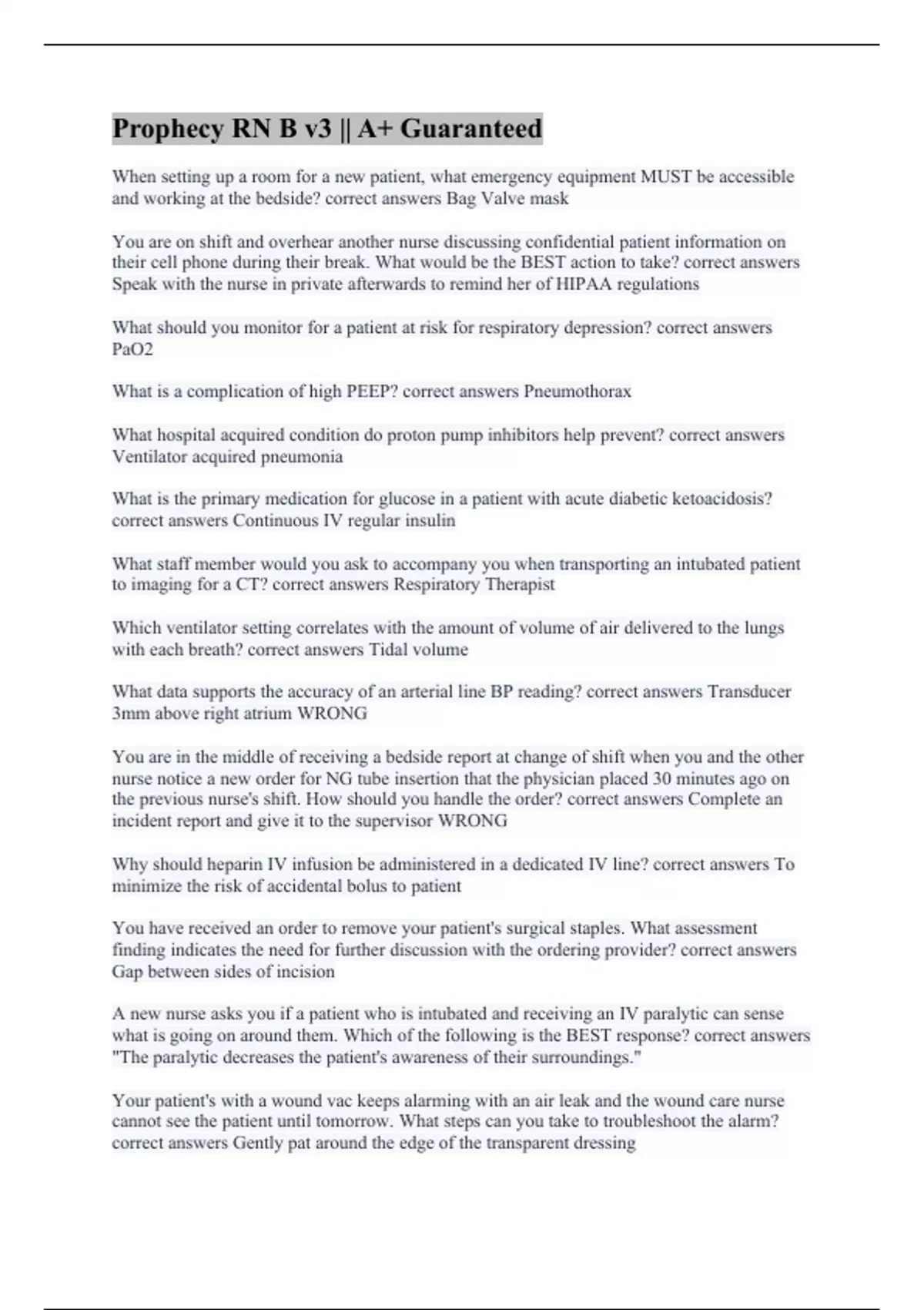 When setting up a room for a new patient, what emergency equipment MUST be accessible and working at the bedside? correct answers Bag Valve mask You are on shift and overhear another nurse discussing confidential patient information on their cell phone during their break. What would be the BEST action to take? correct answers Speak with the nurse in private afterwards to remind her of HIPAA regulations What should you monitor for a patient at risk for respiratory depression? correct answers PaO2 What is a complication of high PEEP? correct answers Pneumothorax What hospital acquired condition do proton pump inhibitors help prevent? correct answers Ventilator acquired pneumonia What is the primary medication for glucose in a patient with acute diabetic ketoacidosis? correct answers Continuous IV regular insulin What staff member would you ask to accompany you when transporting an intubated patient to imaging for a CT? correct answers Respiratory Therapist Which ventilator setting correlates with the amount of volume of air delivered to the lungs with each breath? correct answers Tidal volume What data supports the accuracy of an arterial line BP reading? correct answers Transducer 3mm above right atrium WRONG You are in the middle of receiving a bedside report at change of shift when you and the other nurse notice a new order for NG tube insertion that the physician placed 30 minutes ago on the previous nurse's shift. How should you handle the order? correct answers Complete an incident report and give it to the supervisor WRONG Why should heparin IV infusion be administered in a dedicated IV line? correct answers To minimize the risk of accidental bolus to patient You have received an order to remove your patient's surgical staples. What assessment finding indicates the need for further discussion with the ordering provider? correct answers Gap between sides of incision A new nurse asks you if a patient who is intubated and receiving an IV paralytic can sense what is going on around them. Which of the following is the BEST response? correct answers "The paralytic decreases the patient's awareness of their surroundings." Your patient's with a wound vac keeps alarming with an air leak and the wound care nurse cannot see the patient until tomorrow. What steps can you take to troubleshoot the alarm? correct answers Gently pat around the edge of the transparent dressing