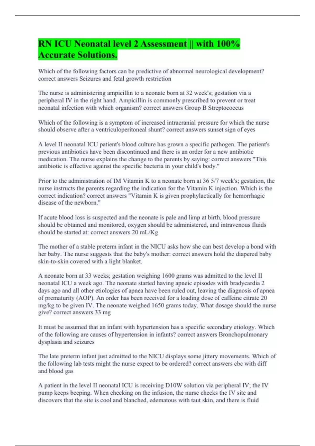 RN ICU Neonatal level 2 Assessment || with 100% Accurate Solutions.