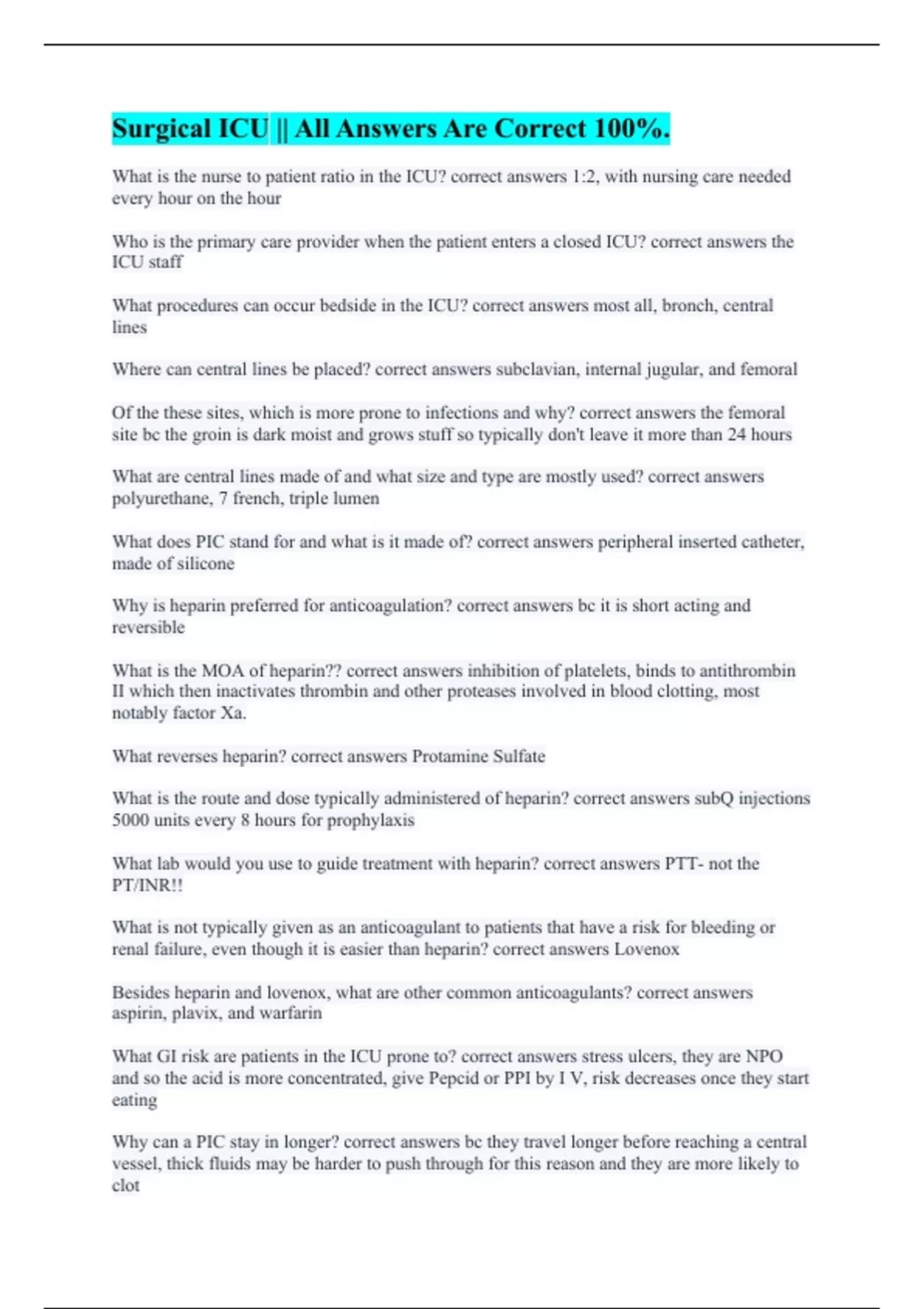 Surgical ICU || All Answers Are Correct 100%.