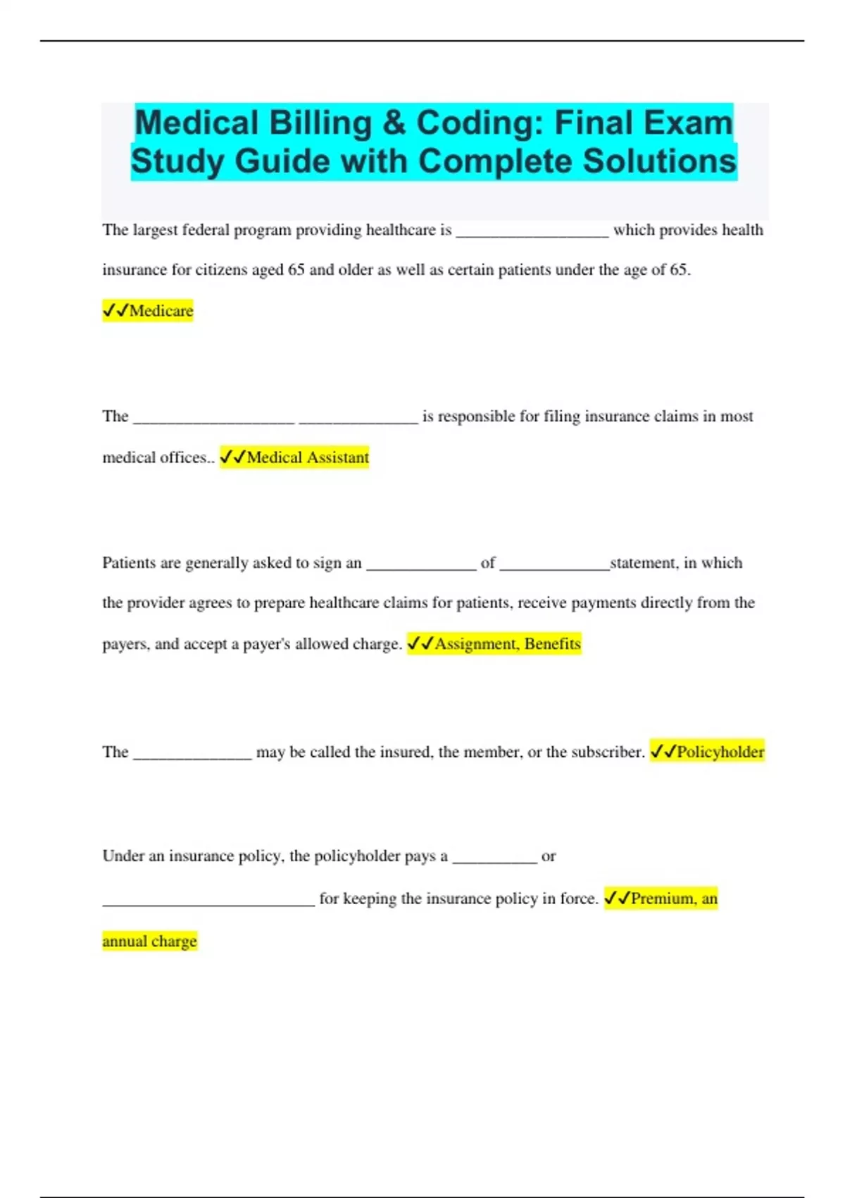 Medical Billing & Coding: Final Exam Study Guide with Complete Solutions The largest federal program providing healthcare is __________________ which provides health insurance for citizens aged 65 and older as well as certain patients under the age of 65. Medicare The ___________________ ______________ is responsible for filing insurance claims in most medical offices.. Medical Assistant Patients are generally asked to sign an _____________ of _____________statement, in which the provider agrees to prepare healthcare claims for patients, receive payments directly from the payers, and accept a payer's allowed charge. Assignment, Benefits The ______________ may be called the insured, the member, or the subscriber. Policyholder Under an insurance policy, the policyholder pays a __________ or _________________________ for keeping the insurance policy in force. Premium, an annual charge A ___________________ is a fixed dollar amount that must be paid or "met" once a year, in addition to the premium, before the third-party payer begins to cover medical expenses. Deductible A ____________________ is a small, fixed fee collected at the time of the visit from the patients who belong to a managed care health plan. Co-payment In a typical medical practice, claims are transmitted within a few business days ____________ the date of service. After Insurance claims could be denied as a billing error because if the treatment was not medically necessary based on the ____________________ and there is no evidence of code linkage. Diagnosis code In the ____________ for ___________ benefits, the claims department compares the fees the physician has charged with the benefits provided by the patient's health insurance policy to determine the amount of deductible or coinsurance the patient owes. Review, Allowable The total amount the patient owes the practice, including coinsurance, copayment, deductible, and noncovered services, is known as the patients __________________. liability _____________________ insurance covers injuries caused by the insured or that occurred on the insured's property. Liability Although eligibility for Medicare Part B is automatic for people entitled to Medicare Part B coverage is not ______________________. Automatic Medicare Part A is a _______________ benefit for patients who are admitted as inpatients for up to the 90-day benefit period. hospital A Medicare benefit period begins the day a patient is admitted to the hospital and ends when that patient has not been hospitalized or placed in a skilled nursing facility for a period of ________ continuous days after discharge. 60 Medicaid is a health cost _________________ program designed for low-income, blind, or disabled patients. It is not an ______________ program. assistance, insurance Workers of any age who have chronic kidney disease requiring dialysis or end-stage renal disease (ESRD) requiring transplant are eligible for ________________. Medicare ____________ is a short break provided for caregivers to terminally ill patients. The patient is moved to a respite care center or other facility to remove responsibility for care from the caregiver temporarily. Respite