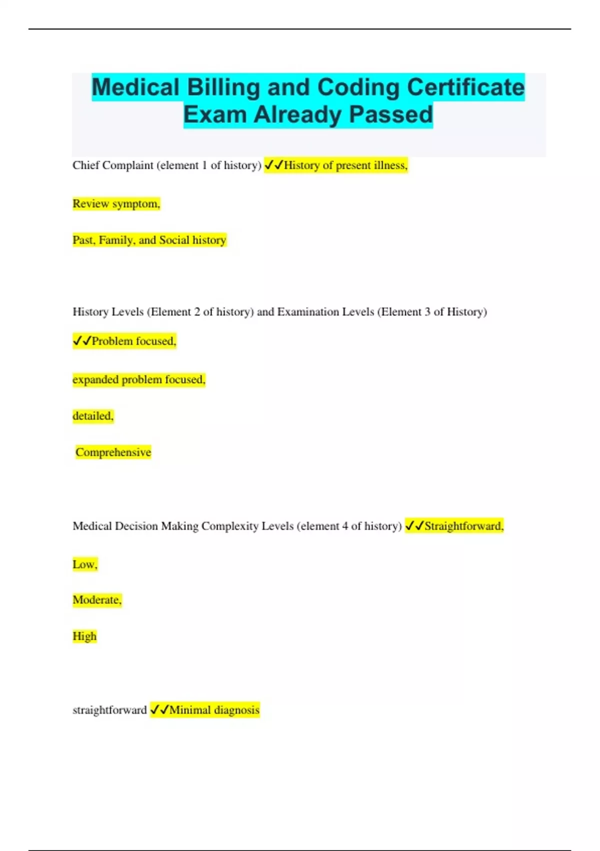 Medical Billing and Coding Certificate Exam Already Passed Chief Complaint (element 1 of history) ✔✔History of present illness, Review symptom, Past, Family, and Social history History Levels (Element 2 of history) and Examination Levels (Element 3 of History) ✔✔Problem focused, expanded problem focused, detailed, Comprehensive Medical Decision Making Complexity Levels (element 4 of history) ✔✔Straightforward, Low, Moderate, High straightforward ✔✔Minimal diagnosis Minimal risk Minimal complexity of data Low ✔✔Limited diagnosis Limited/low risk to patient Limited data Moder ate ✔✔Multiple diagnosis Moderate risk to patient Moderate amount and complexity of data high ✔✔Extensive diagnosis high risk to patient extensive amount and complexity of data truncated coding (error in coding) ✔✔using diagnosis codes that are not as sp ecific as possible assumption coding (fraudulent coding) ✔✔reporting items of services that are not actually documented errors of the coding process ✔✔-altering documentation after services are reported -coding without documentation -reporting services p rovided by unlicensed or unqualified clinical personnel -coding a unilateral service twice instead of choosing the bilateral -not satisfying the condition of coverage for a particular service -codes that report more than one diagnosis with one code is a combination code Unbundling codes ✔✔when multiple codes are used to code a procedure when a single code should be used Upcoding ✔✔using a procedural code that provides a higher reimbursement r ate than the correct code Downcoding ✔✔the document does not justify the level of service