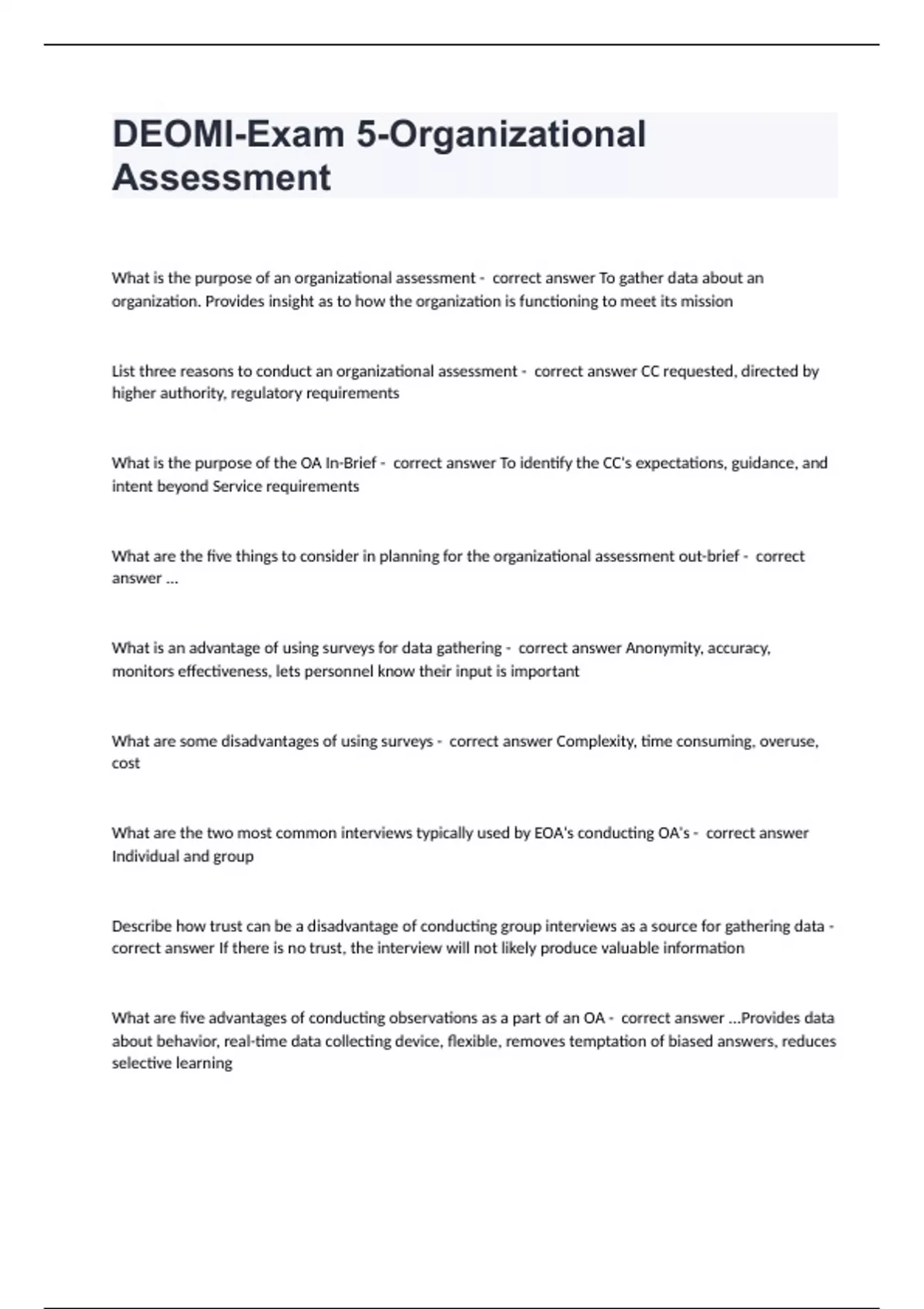 DEOMI-Exam 5-Organizational Assessment What is the purpose of an organizational assessment - correct answer To gather data about an organization. Provides insight as to how the organization is functioning to meet its mission List three reasons to conduct an organizational assessment - correct answer CC requested, directed by higher authority, regulatory requirements What is the purpose of the OA In-Brief - correct answer To identify the CC's expectations, guidance, and intent beyond Service requirements What are the five things to consider in planning for the organizational assessment out-brief - correct answer ... What is an advantage of using surveys for data gathering - correct answer Anonymity, accuracy, monitors effectiveness, lets personnel know their input is important What are some disadvantages of using surveys - correct answer Complexity, time consuming, overuse, cost What are the two most common interviews typically used by EOA's conducting OA's - correct answer Individual and group Describe how trust can be a disadvantage of conducting group interviews as a source for gathering data - correct answer If there is no trust, the interview will not likely produce valuable information What are five advantages of conducting observations as a part of an OA - correct answer ...Provides data about behavior, real-time data collecting device, flexible, removes temptation of biased answers, reduces selective learning