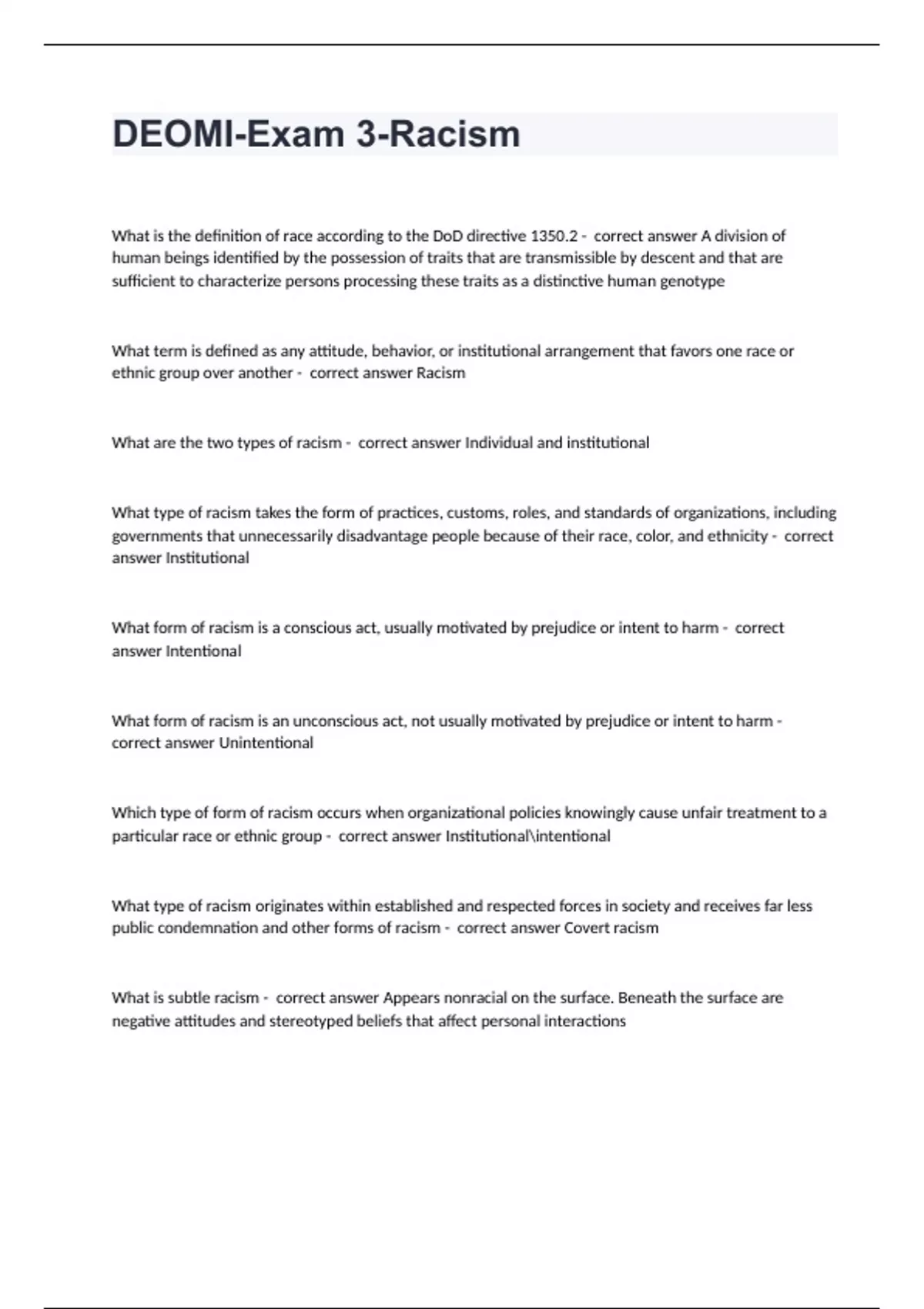 DEOMI-Exam 3-RacismWhat is the definition of race according to the DoD directive 1350.2 - correct answer A division of human beings identified by the possession of traits that are transmissible by descent and that are sufficient to characterize persons processing these traits as a distinctive human genotype What term is defined as any attitude, behavior, or institutional arrangement that favors one race or ethnic group over another - correct answer Racism What are the two types of racism - correct answer Individual and institutional What type of racism takes the form of practices, customs, roles, and standards of organizations, including governments that unnecessarily disadvantage people because of their race, color, and ethnicity - correct answer Institutional What form of racism is a conscious act, usually motivated by prejudice or intent to harm - correct answer Intentional What form of racism is an unconscious act, not usually motivated by prejudice or intent to harm - correct answer Unintentional Which type of form of racism occurs when organizational policies knowingly cause unfair treatment to a particular race or ethnic group - correct answer Institutionalintentional What type of racism originates within established and respected forces in society and receives far less public condemnation and other forms of racism - correct answer Covert racism What is subtle racism - correct answer Appears nonracial on the surface. Beneath the surface are negative attitudes and stereotyped beliefs that affect personal interactions