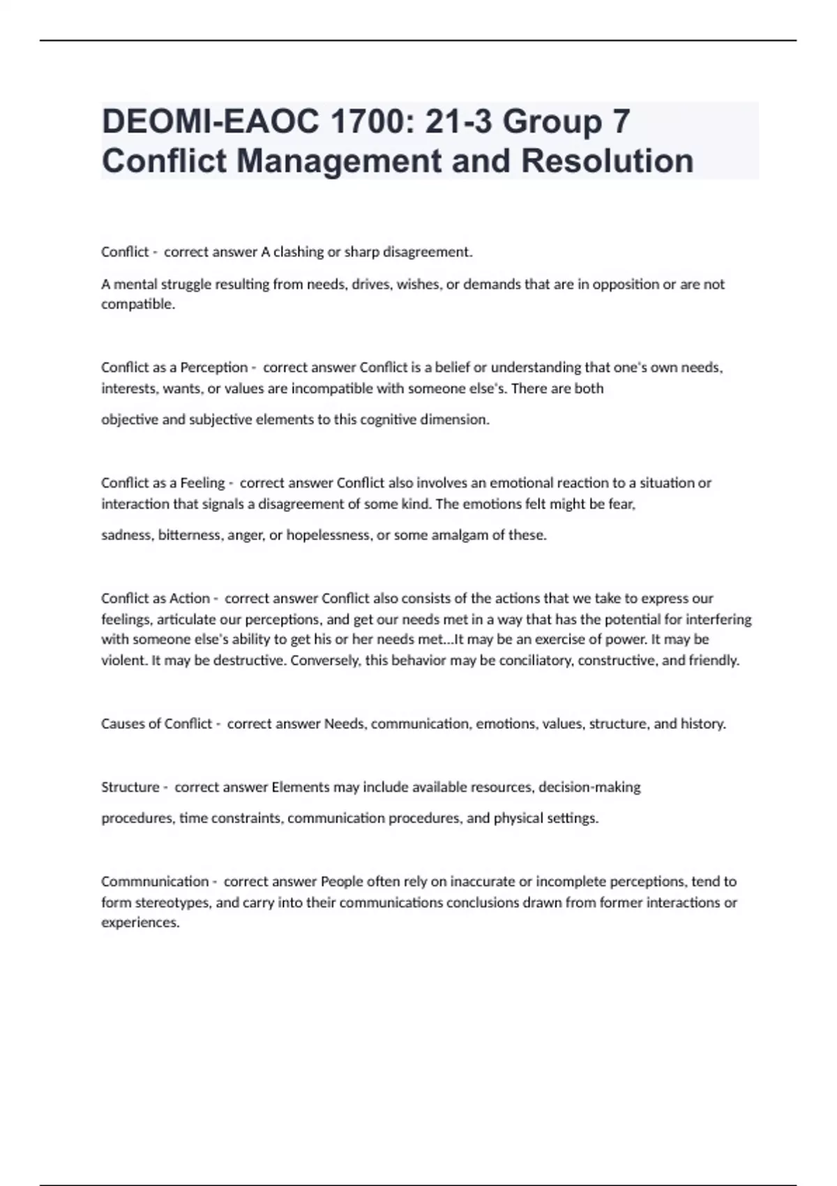 DEOMI-EAOC 1700: 21-3 Group 7 Conflict Management and ResolutionConflict - correct answer A clashing or sharp disagreement. A mental struggle resulting from needs, drives, wishes, or demands that are in opposition or are not compatible. Conflict as a Perception - correct answer Conflict is a belief or understanding that one's own needs, interests, wants, or values are incompatible with someone else's. There are both objective and subjective elements to this cognitive dimension. Conflict as a Feeling - correct answer Conflict also involves an emotional reaction to a situation or interaction that signals a disagreement of some kind. The emotions felt might be fear, sadness, bitterness, anger, or hopelessness, or some amalgam of these. Conflict as Action - correct answer Conflict also consists of the actions that we take to express our feelings, articulate our perceptions, and get our needs met in a way that has the potential for interfering with someone else's ability to get his or her needs met...It may be an exercise of power. It may be violent. It may be destructive. Conversely, this behavior may be conciliatory, constructive, and friendly. Causes of Conflict - correct answer Needs, communication, emotions, values, structure, and history. Structure - correct answer Elements may include available resources, decision-making procedures, time constraints, communication procedures, and physical settings. Commnunication - correct answer People often rely on inaccurate or incomplete perceptions, tend to form stereotypes, and carry into their communications conclusions drawn from former interactions or experiences. Emotions - correct answer If people could always stay perfectly rational and focused on how to best meet their needs and accommodate those of others, and if they could calmly work to establish effective communications, then many conflicts would either never arise or would quickly deescalate. Values - correct answer It is hard for people to compromise when core beliefs are in play, because they feel they are compromising themselves or their integrity. History - correct answer The history of the people who are participants in a conflict, of the systems in which the conflict is occurring, and of the issues themselves, has a powerful influence on the course of the conflict. Positive Effects of Conflict - correct answer Increased motivation Enhanced problem/solution identification Group cohesiveness Reality adjustment Increased knowledge/skill Enhanced creativity Contribution to goal attainment Incentive for growth Negative Effects of Conflict - correct answer Decreased productivity Erosion of trust Coalition formation with polarized positions Secrecy and reduced information flow Morale problems Consumption of mass amounts of time Decision-making paralysis Power-Based Approaches - correct answer Conflict management strategies that are often destructive, sometimes violent, can be disruptive and costly, seldom lead directly to improved relations, but are not always harmful.