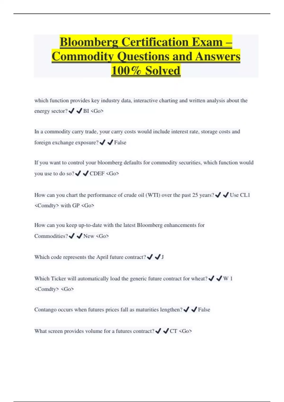 Bloomberg Certification Exam – Commodity Questions and Answers 100% Solved which function provides key industry data, interactive charting and written analysis about the energy sector?️️BI <Go> In a commodity carry trade, your carry costs would include interest rate, storage costs and foreign exchange exposure?️️False If you want to control your bloomberg defaults for commodity securities, which function would you use to do so?️️CDEF <Go> How can you chart the performance of crude oil (WTI) over the past 25 years?️️Use CL1 <Comdty> with GP <Go> How can you keep up-to-date with the latest Bloomberg enhancements for Commodities?️️New <Go> Which code represents the April future contract?️️J Which Ticker will automatically load the generic future contract for wheat?️️W 1 <Comdty> <Go> Contango occurs when futures prices fall as maturities lengthen?️️False What screen provides volume for a futures contract?️️CT <Go>