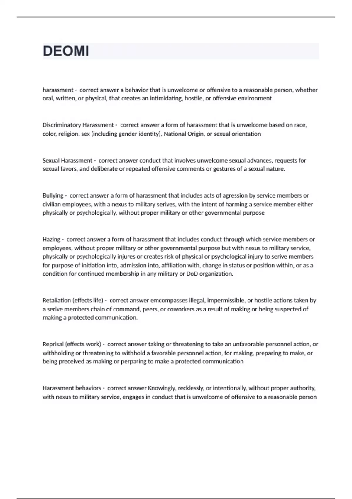 DEOMIharassment - correct answer a behavior that is unwelcome or offensive to a reasonable person, whether oral, written, or physical, that creates an intimidating, hostile, or offensive environment Discriminatory Harassment - correct answer a form of harassment that is unwelcome based on race, color, religion, sex (including gender identity), National Origin, or sexual orientation Sexual Harassment - correct answer conduct that involves unwelcome sexual advances, requests for sexual favors, and deliberate or repeated offensive comments or gestures of a sexual nature. Bullying - correct answer a form of harassment that includes acts of agression by service members or civilian employees, with a nexus to military serives, with the intent of harming a service member either physically or psychologically, without proper military or other governmental purpose Hazing - correct answer a form of harassment that includes conduct through which service members or employees, without proper military or other governmental purpose but with nexus to military service, physically or psychologically injures or creates risk of physical or psychological injury to serive members for purpose of initiation into, admission into, affiliation with, change in status or position within, or as a condition for continued membership in any military or DoD organization. Retaliation (effects life) - correct answer emcompasses illegal, impermissible, or hostile actions taken by a serive members chain of command, peers, or coworkers as a result of making or being suspected of making a protected communication. Reprisal (effects work) - correct answer taking or threatening to take an unfavorable personnel action, or withholding or threatening to withhold a favorable personnel action, for making, preparing to make, or being preceived as making or perparing to make a protected communication Harassment behaviors - correct answer Knowingly, recklessly, or intentionally, without proper authority, with nexus to military service, engages in conduct that is unwelcome of offensive to a reasonable person