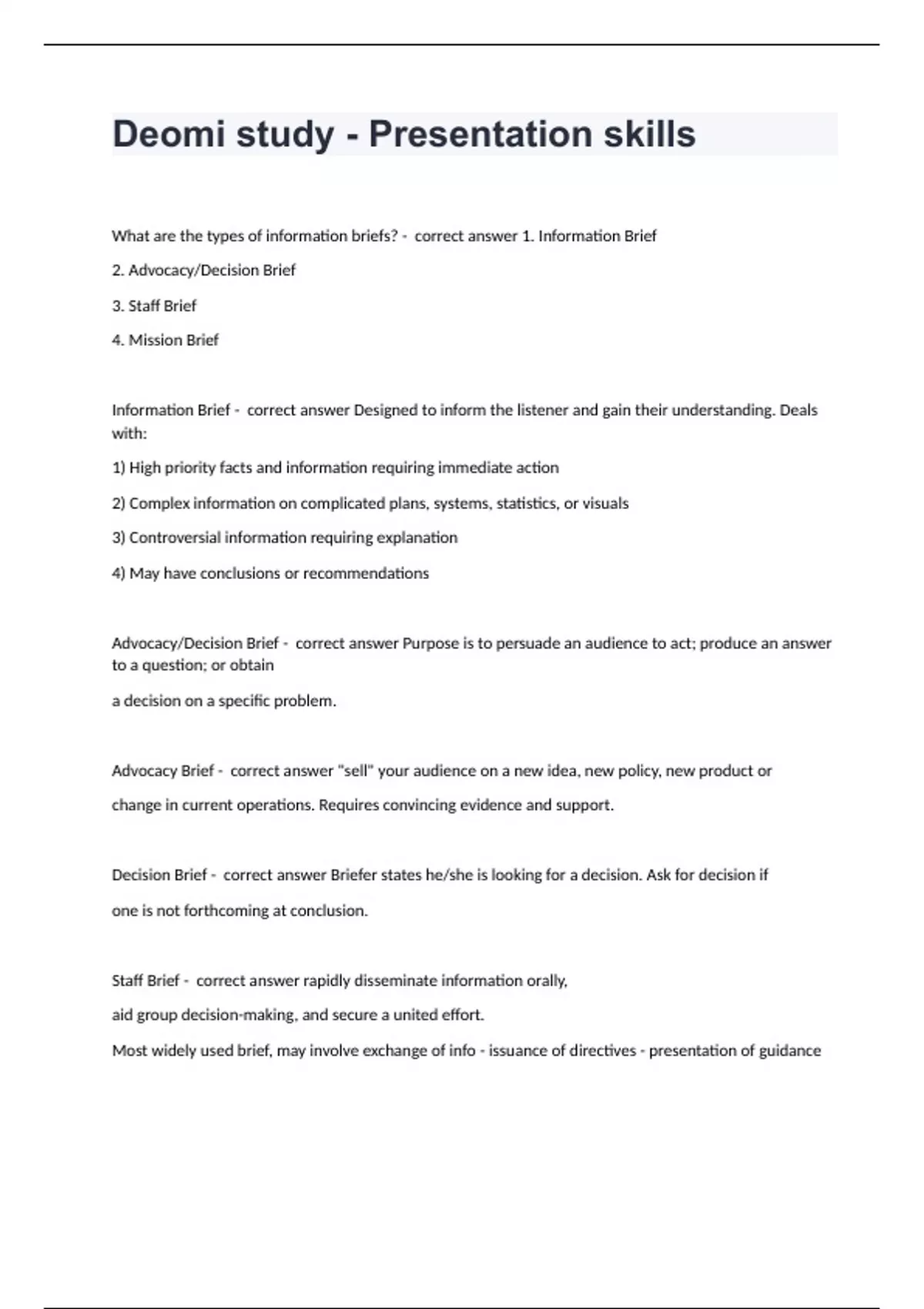 Deomi study - Presentation skillsWhat are the types of information briefs? - correct answer 1. Information Brief 2. Advocacy/Decision Brief 3. Staff Brief 4. Mission Brief Information Brief - correct answer Designed to inform the listener and gain their understanding. Deals with: 1) High priority facts and information requiring immediate action 2) Complex information on complicated plans, systems, statistics, or visuals 3) Controversial information requiring explanation 4) May have conclusions or recommendations Advocacy/Decision Brief - correct answer Purpose is to persuade an audience to act; produce an answer to a question; or obtain a decision on a specific problem. Advocacy Brief - correct answer "sell" your audience on a new idea, new policy, new product or change in current operations. Requires convincing evidence and support. Decision Brief - correct answer Briefer states he/she is looking for a decision. Ask for decision if one is not forthcoming at conclusion. Staff Brief - correct answer rapidly disseminate information orally, aid group decision-making, and secure a united effort. Most widely used brief, may involve exchange of info - issuance of directives - presentation of guidance