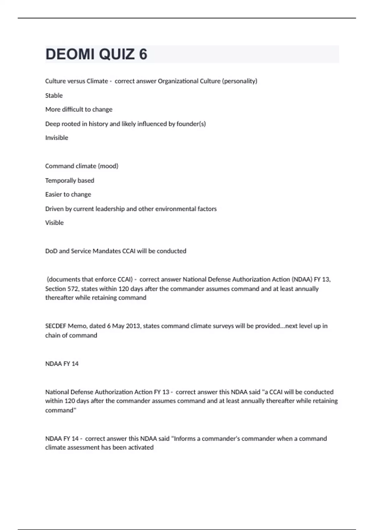 DEOMI QUIZ 6Culture versus Climate - correct answer Organizational Culture (personality) Stable More difficult to change Deep rooted in history and likely influenced by founder(s) Invisible Command climate (mood) Temporally based Easier to change Driven by current leadership and other environmental factors Visible DoD and Service Mandates CCAI will be conducted (documents that enforce CCAI) - correct answer National Defense Authorization Action (NDAA) FY 13, Section 572, states within 120 days after the commander assumes command and at least annually thereafter while retaining command SECDEF Memo, dated 6 May 2013, states command climate surveys will be provided...next level up in chain of command NDAA FY 14 National Defense Authorization Action FY 13 - correct answer this NDAA said "a CCAI will be conducted within 120 days after the commander assumes command and at least annually thereafter while retaining command" NDAA FY 14 - correct answer this NDAA said "Informs a commander's commander when a command climate assessment has been activated