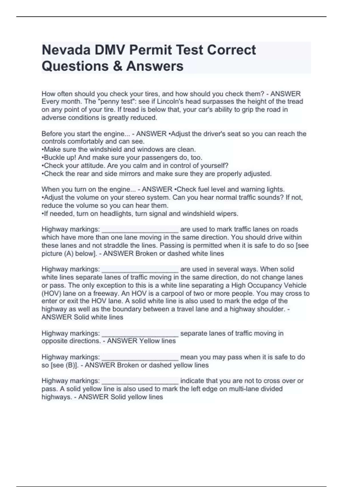 How often should you check your tires, and how should you check them? - ANSWER Every month. The "penny test": see if Lincoln's head surpasses the height of the tread on any point of your tire. If tread is below that, your car's ability to grip the road in adverse conditions is greatly reduced. Before you start the engine... - ANSWER •Adjust the driver's seat so you can reach the controls comfortably and can see. •Make sure the windshield and windows are clean. •Buckle up! And make sure your passengers do, too. •Check your attitude. Are you calm and in control of yourself? •Check the rear and side mirrors and make sure they are properly adjusted. When you turn on the engine... - ANSWER •Check fuel level and warning lights. •Adjust the volume on your stereo system. Can you hear normal traffic sounds? If not, reduce the volume so you can hear them. •If needed, turn on headlights, turn signal and windshield wipers. Highway markings: ____________________ are used to mark traffic lanes on roads which have more than one lane moving in the same direction. You should drive within these lanes and not straddle the lines. Passing is permitted when it is safe to do so [see picture (A) below]. - ANSWER Broken or dashed white lines Highway markings: ____________________ are used in several ways. When solid white lines separate lanes of traffic moving in the same direction, do not change lanes or pass. The only exception to this is a white line separating a High Occupancy Vehicle (HOV) lane on a freeway. An HOV is a carpool of two or more people. You may cross to enter or exit the HOV lane. A solid white line is also used to mark the edge of the highway as well as the boundary between a travel lane and a highway shoulder. - ANSWER Solid white lines Highway markings: ____________________ separate lanes of traffic moving in opposite directions. - ANSWER Yellow lines Highway markings: ____________________ mean you may pass when it is safe to do so [see (B)]. - ANSWER Broken or dashed yellow lines Highway markings: ____________________ indicate that you are not to cross over or pass. A solid yellow line is also used to mark the left e