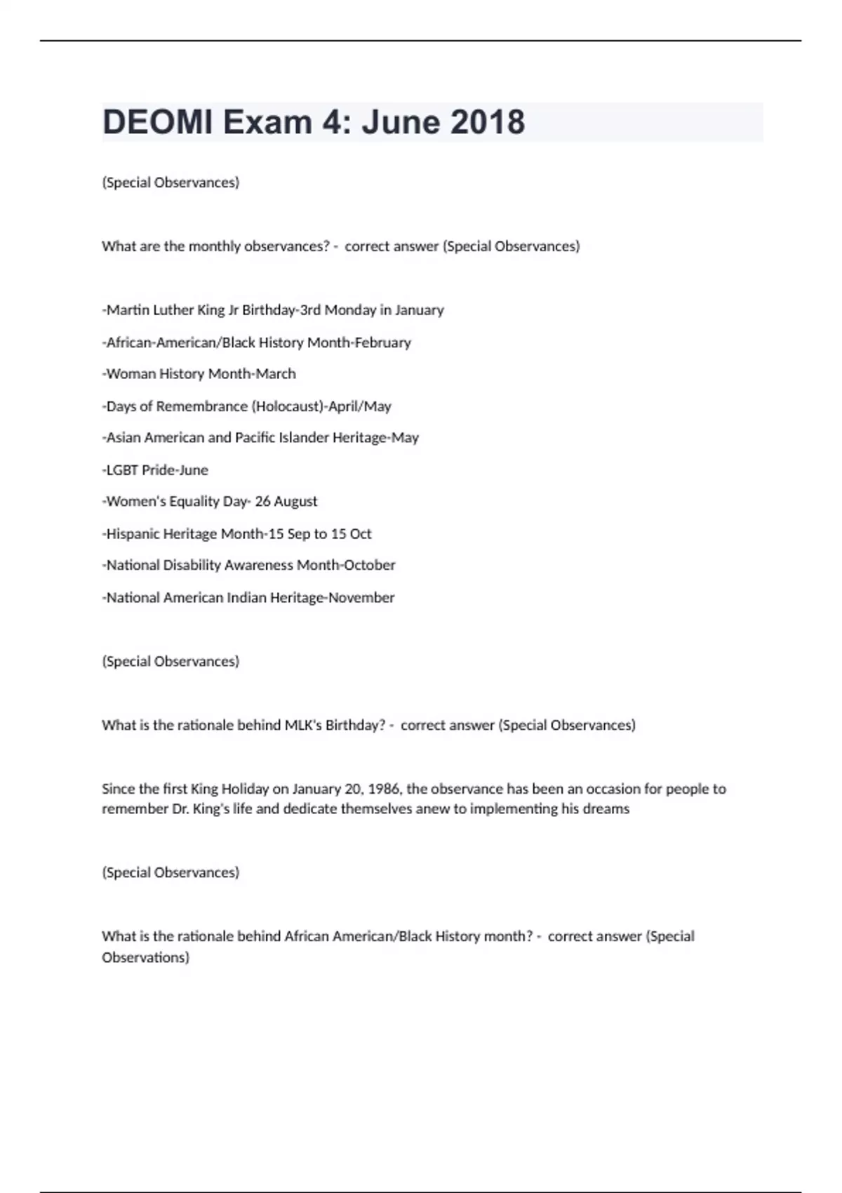 DEOMI Exam 4: June 2018(Special Observances) What are the monthly observances? - correct answer (Special Observances) -Martin Luther King Jr Birthday-3rd Monday in January -African-American/Black History Month-February -Woman History Month-March -Days of Remembrance (Holocaust)-April/May -Asian American and Pacific Islander Heritage-May -LGBT Pride-June -Women's Equality Day- 26 August -Hispanic Heritage Month-15 Sep to 15 Oct -National Disability Awareness Month-October -National American Indian Heritage-November (Special Observances) What is the rationale behind MLK's Birthday? - correct answer (Special Observances) Since the first King Holiday on January 20, 1986, the observance has been an occasion for people to remember Dr. King's life and dedicate themselves anew to implementing his dreams (Special Observances) What is the rationale behind African American/Black History month? - correct answer (Special Observations)