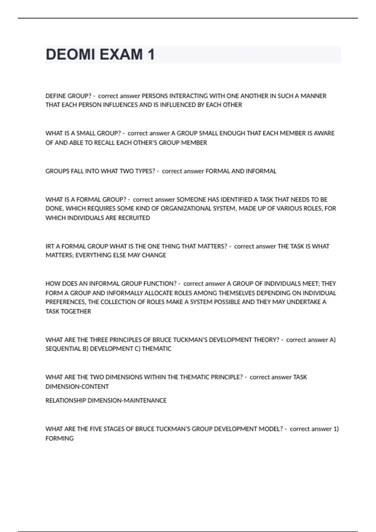 DEOMI EXAM 1 DEFINE GROUP? - correct answer PERSONS INTERACTING WITH ONE ANOTHER IN SUCH A MANNER THAT EACH PERSON INFLUENCES AND IS INFLUENCED BY EACH OTHER WHAT IS A SMALL GROUP? - correct answer A GROUP SMALL ENOUGH THAT EACH MEMBER IS AWARE OF AND ABLE TO RECALL EACH OTHER'S GROUP MEMBER GROUPS FALL INTO WHAT TWO TYPES? - correct answer FORMAL AND INFORMAL WHAT IS A FORMAL GROUP? - correct answer SOMEONE HAS IDENTIFIED A TASK THAT NEEDS TO BE DONE, WHICH REQUIRES SOME KIND OF ORGANIZATIONAL SYSTEM, MADE UP OF VARIOUS ROLES, FOR WHICH INDIVIDUALS ARE RECRUITED IRT A FORMAL GROUP WHAT IS THE ONE THING THAT MATTERS? - correct answer THE TASK IS WHAT MATTERS; EVERYTHING ELSE MAY CHANGE HOW DOES AN INFORMAL GROUP FUNCTION? - correct answer A GROUP OF INDIVIDUALS MEET; THEY FORM A GROUP AND INFORMALLY ALLOCATE ROLES AMONG THEMSELVES DEPENDING ON INDIVIDUAL PREFERENCES, THE COLLECTION OF ROLES MAKE A SYSTEM POSSIBLE AND THEY MAY UNDERTAKE A TASK TOGETHER WHAT ARE THE THREE PRINCIPLES OF BRUCE TUCKMAN'S DEVELOPMENT THEORY? - correct answer A) SEQUENTIAL B) DEVELOPMENT C) THEMATIC WHAT ARE THE TWO DIMENSIONS WITHIN THE THEMATIC PRINCIPLE? - correct answer TASK DIMENSION-CONTENT RELATIONSHIP DIMENSION-MAINTENANCE WHAT ARE THE FIVE STAGES OF BRUCE TUCKMAN'S GROUP DEVELOPMENT MODEL? - correct answer 1) FORMING 2) STORMING 3) NORMING 4) PERFORMING 5) ADJOURNING WHAT ARE SOME CHARACTERISTICS OF THE FORMING STAGE? - correct answer INITIALLY POLITE AND SUPERFICIAL; EACH PERSON SEEKS OUT SIMILARITIES OR COMMON NEEDS; EACH INDIVIDUAL TESTS THE AMOUNT OF COMPATIBILITY; INDIVIDUALS BEGIN TO CHALLENGE DIFFERENCES IN A BID TO REGAIN THEIR INDIVIDUALITY, POWER AND INFLUENCE WHAT ARE SOME CHARACTERISTICS OF THE STORMING STAGE? - correct answer MOST DIFFICULT STAGE; GROUP MEMBERS REALIZE THE TASK IS DIFFERENT OR MORE DIFFICULT THAN THEY IMAGINED; IMPATIENT ABOUT THE LACK OF PROGRESS; ARGUE ABOUT ACTIONS GROUP SHOULD TAKE; MEMBERS RELY SOLEY ON THEIR PERSONAL AND PROFESSIONAL EXPERIENCE; RESIST COLLABORATION WHEN MEMBERS RECONCILE COMPETING LOYALTIES AND RESPONSIBILITIES, WHAT STAGE IS THE GROUP IN IRT TUCKERMAN'S THEORY? - correct answer NORMING WHEN THE GROUP BEGINS TO DIAGNOSE AND SOLVE PROBLEMS AND CHOOSING AND IMPLEMENTING CHANGES, WHAT STAGE DOES THIS DESCRIBE? - correct answer PERFORMING WHAT ARE CHARACTERISTICS DESCRIBE THE ADJOURNING STAGE? - correct answer THE GROUP BEGINS TO EXPERIENCE ANXIETY ABOUT SEPARATION AND TERMINATION TO HELP CREATE AN ENVIRONMENT WHERE GROUP MEMBER'S CAN FULLY PARTICIPATE IN GROUP DISCUSSIONS, MEMBERS MUST DEVELOP A SET OF RULES OR OPERATING PROCEDURES TO COORDINATE THEIR INDIVIDUAL BEHAVIORS INTO A SYSTEM. WHAT TWO GROUPS DO THESE RULES FALL INTO? - correct answer FORMAL-WRITTEN RULES INFORMAL-DO NOT SPECIFY ABSOLUTES; RANGES; SELF IMPOSED NORMS INFORMAL RULES ARE BROKEN DOWN INTO WHAT TWO CATEGORIES? - correct answer GENERAL-DIRECT BEHAVIOR OF GROUP AS A WHOLE ROLE-SPECIFIC-INDIVIDUAL MEMBERS WITH PARTICULAR ROLES