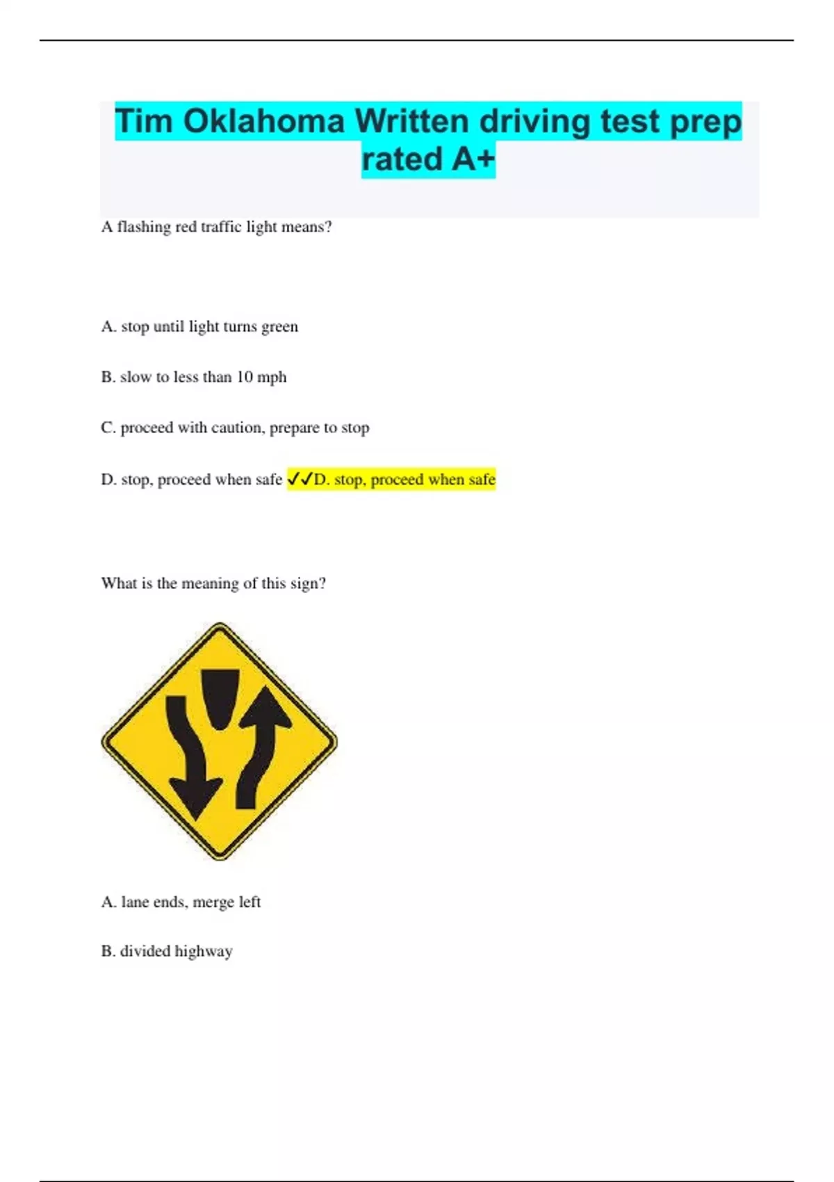 Tim Oklahoma Written driving test prep rated A+ A flashing red traffic light means? A. stop until light turns green B. slow to less than 10 mph C. proceed with caution, prepare to stop D. stop, proceed when safe D. stop, proceed when safe What is the meaning of this sign? A. lane ends, merge left B. divided highway C. two-way traffic D. no right turn B. divided Highway Carbon monoxide coming from your car smells like? A. burning leaves B. Fresh gasoline C. Burning rubber D. Has no odor D. Has no odor What lights should a driver use when driving in the fog? A. parking lights B. low beam headlights C. high beam headlights D. Emergency flashers B. low beam headlights What is the meaning of this sign? A. Pedestrian crossing B. hospital C. school zone D. bus stop A. pedestrian crossing Which of the following affects a motorcyclist more than operators of other vehicles? A. heavy traffic B. blind intersections C. bright headlights D. road and weather conditions D. road and weather conditions What is the meaning of this sign? A. railroad crossing