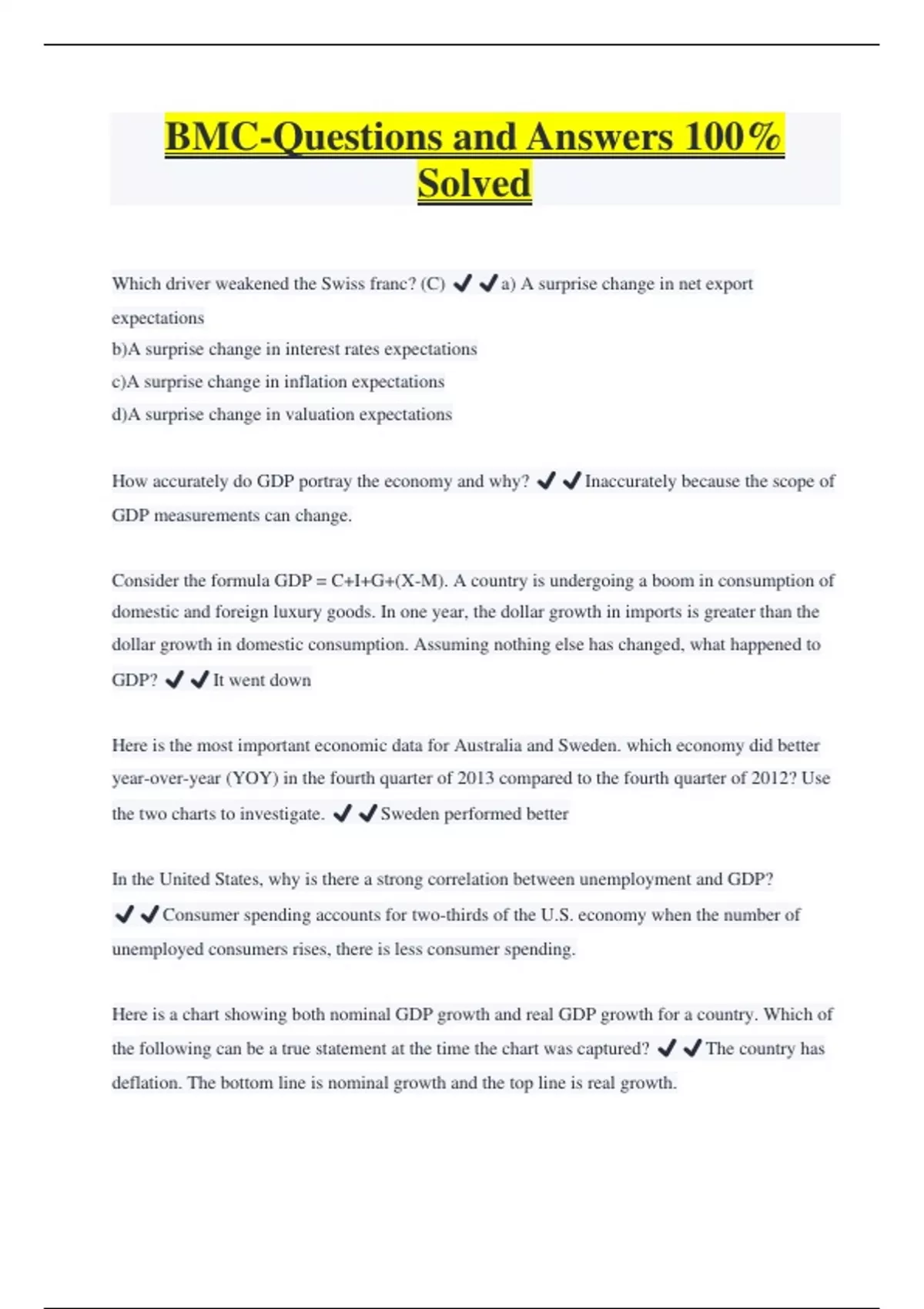 BMC-Questions and Answers 100% Solved Which driver weakened the Swiss franc? (C) ️️a) A surprise change in net export expectations b)A surprise change in interest rates expectations c)A surprise change in inflation expectations d)A surprise change in valuation expectations How accurately do GDP portray the economy and why? ️️Inaccurately because the scope of GDP measurements can change. Consider the formula GDP = C+I+G+(X-M). A country is undergoing a boom in consumption of domestic and foreign luxury goods. In one year, the dollar growth in imports is greater than the dollar growth in domestic consumption. Assuming nothing else has changed, what happened to GDP? ️️It went down