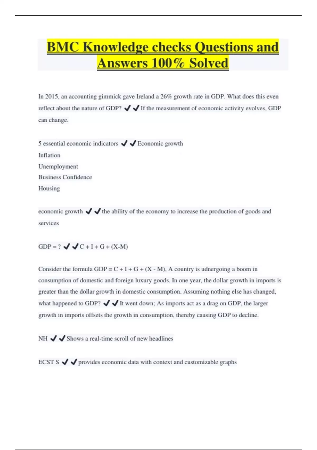 BMC Knowledge checks Questions and Answers 100% Solved In 2015, an accounting gimmick gave Ireland a 26% growth rate in GDP. What does this even reflect about the nature of GDP? ️️If the measurement of economic activity evolves, GDP can change. 5 essential economic indicators ️️Economic growth Inflation Unemployment Business Confidence Housing economic growth ️️the ability of the economy to increase the production of goods and services GDP = ? ️️C + I + G + (X-M) Consider the formula GDP = C + I + G + (X - M), A country is udnergoing a boom in consumption of domestic and foreign luxury goods. In one year, the dollar growth in imports is greater than the dollar growth in domestic consumption. Assuming nothing else has changed, what happened to GDP? ️️It went down; As imports act as a drag on GDP, the larger growth in imports offsets the growth in consumption, thereby causing GDP to decline. NH ️️Shows a real-time scroll of new headlines ECST S ️️provides economic data with context and customizable graphs