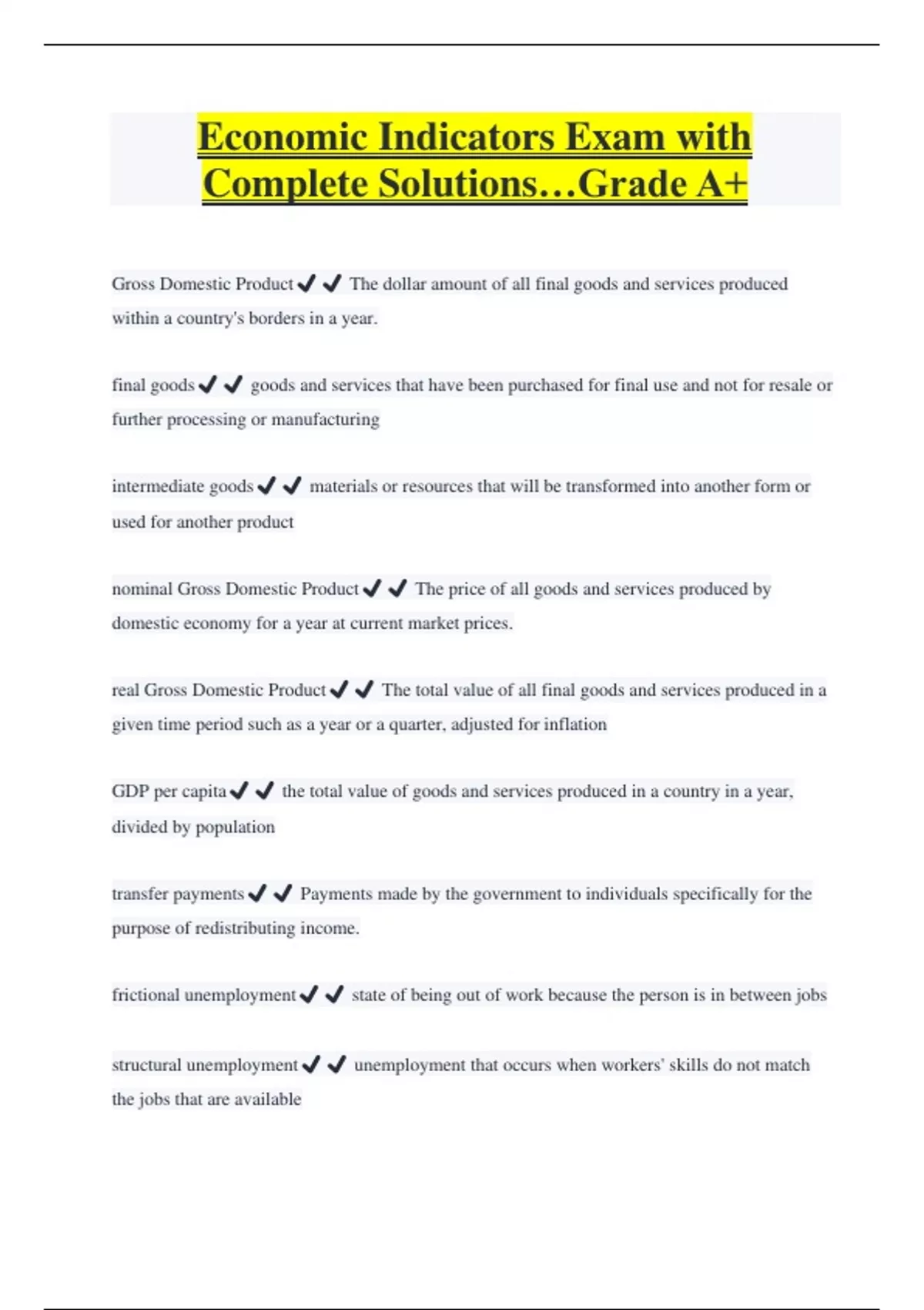 Economic Indicators Exam with Complete Solutions…Grade A+ Gross Domestic Product️️ The dollar amount of all final goods and services produced within a country's borders in a year. final goods️️ goods and services that have been purchased for final use and not for resale or further processing or manufacturing intermediate goods️️ materials or resources that will be transformed into another form or used for another product nominal Gross Domestic Product️️ The price of all goods and services produced by domestic economy for a year at current market prices. real Gross Domestic Product️️ The total value of all final goods and services produced in a given time period such as a year or a quarter, adjusted for inflation GDP per capita️️ the total value of goods and services produced in a country in a year, divided by population transfer payments️️ Payments made by the government to individuals specifically for the purpose of redistributing income. frictional unemployment️️ state of being out of work because the person is in between jobs structural unemployment️️ unemployment that occurs when workers' skills do not match the jobs that are available