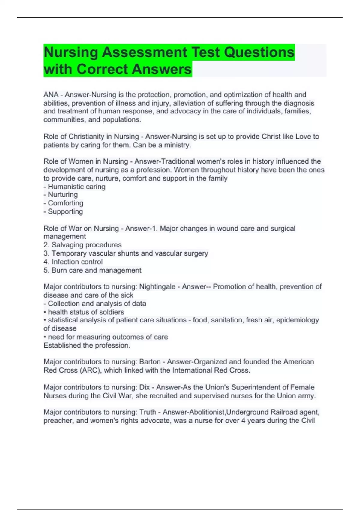 Nursing Assessment Test Questions with Correct Answers