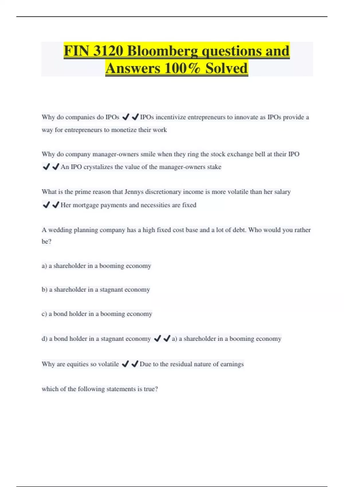 FIN 3120 Bloomberg questions and Answers 100% Solved Why do companies do IPOs ️️IPOs incentivize entrepreneurs to innovate as IPOs provide a way for entrepreneurs to monetize their work Why do company manager-owners smile when they ring the stock exchange bell at their IPO ️️An IPO crystalizes the value of the manager-owners stake What is the prime reason that Jennys discretionary income is more volatile than her salary ️️Her mortgage payments and necessities are fixed A wedding planning company has a high fixed cost base and a lot of debt. Who would you rather be? a) a shareholder in a booming economy b) a shareholder in a stagnant economy c) a bond holder in a booming economy d) a bond holder in a stagnant economy ️️a) a shareholder in a booming economy Why are equities so volatile ️️Due to the residual nature of earnings