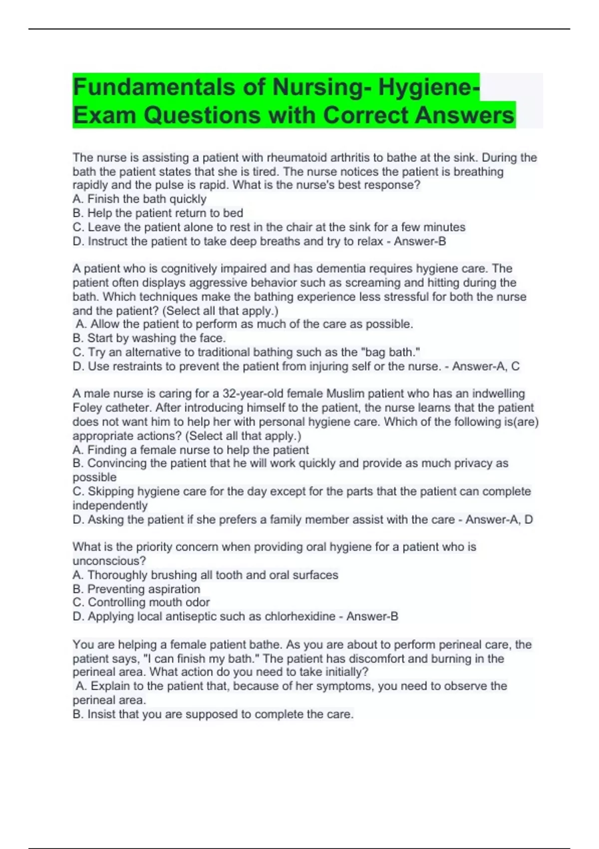 Fundamentals of Nursing- Hygiene- Exam Questions with Correct Answers