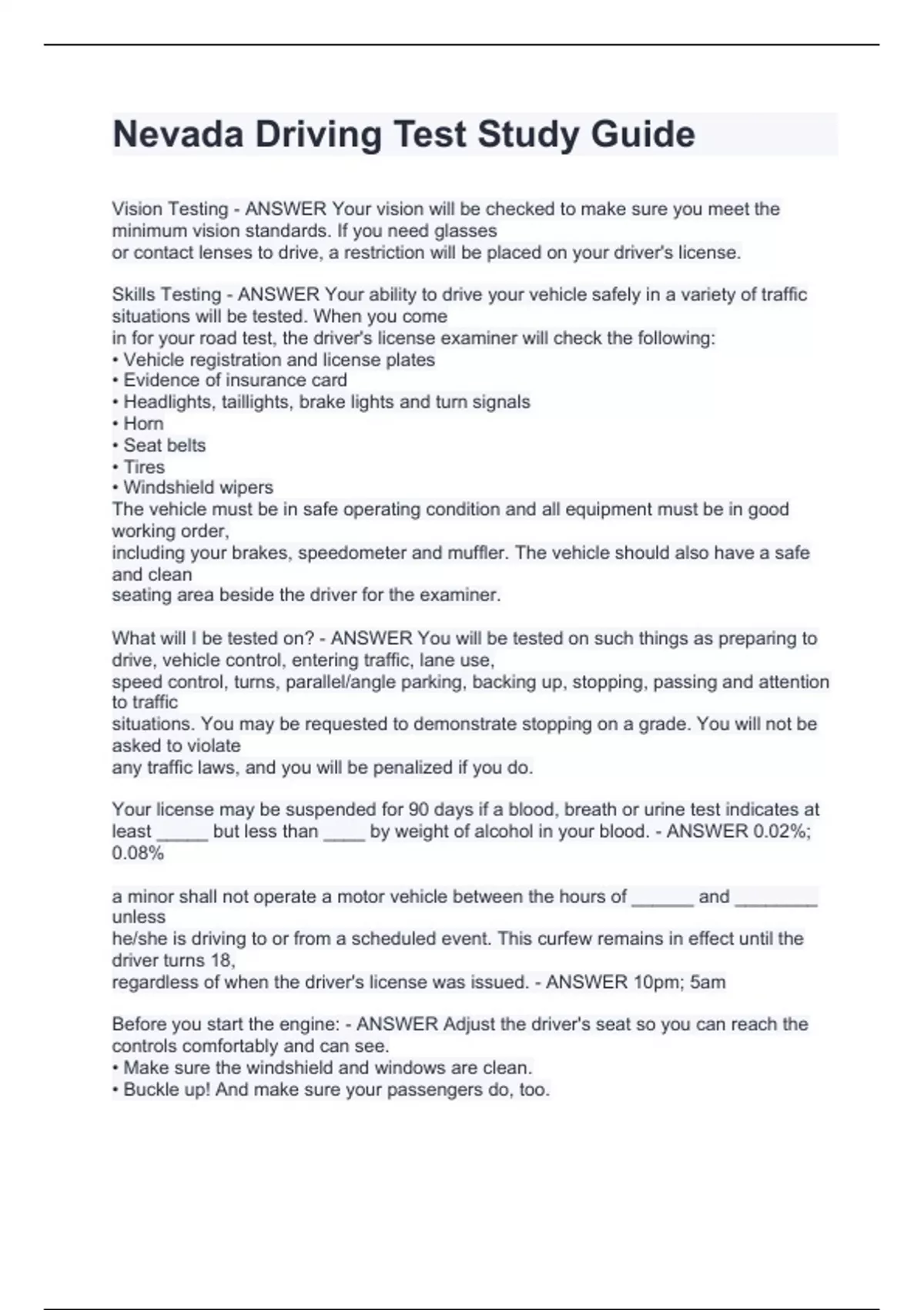 Vision Testing - ANSWER Your vision will be checked to make sure you meet the minimum vision standards. If you need glasses or contact lenses to drive, a restriction will be placed on your driver's license. Skills Testing - ANSWER Your ability to drive your vehicle safely in a variety of traffic situations will be tested. When you come in for your road test, the driver's license examiner will check the following: • Vehicle registration and license plates • Evidence of insurance card • Headlights, taillights, brake lights and turn signals • Horn • Seat belts • Tires • Windshield wipers The vehicle must be in safe operating condition and all equipment must be in good working order, including your brakes, speedometer and muffler. The vehicle should also have a safe and clean seating area beside the driver for the examiner. What will I be tested on? - ANSWER You will be tested on such things as preparing to drive, vehicle control, entering traffic, lane use, speed control, turns, parallel/angle parking, backing up, stopping, passing and attention to traffic situations. You may be requested to demonstrate stopping on a grade. You will not be asked to violate any traffic laws, and you will be penalized if you do. Your license may be suspended for 90 days if a blood, breath or urine test indicates at least _____ but less than ____ by weight of alcohol in your blood. - ANSWER 0.02%; 0.08% a minor shall not operate a motor vehicle between the hours of ______ and ________ unless he/she is driving to or from a scheduled event. This curfew remains in effect until the driver turns 18, regardless of when the driver's license was issued. - ANSWER 10pm; 5am Before you start the engine: - ANSWER Adjust the driver's seat so you can reach the controls comfortably and can see. • Make sure the windshield and windows are clean. • Buckle up! And make sure your passengers do, too. • Check your attitude. Are you calm and in control of yourself? • Check the rear and side mirrors and make sure they