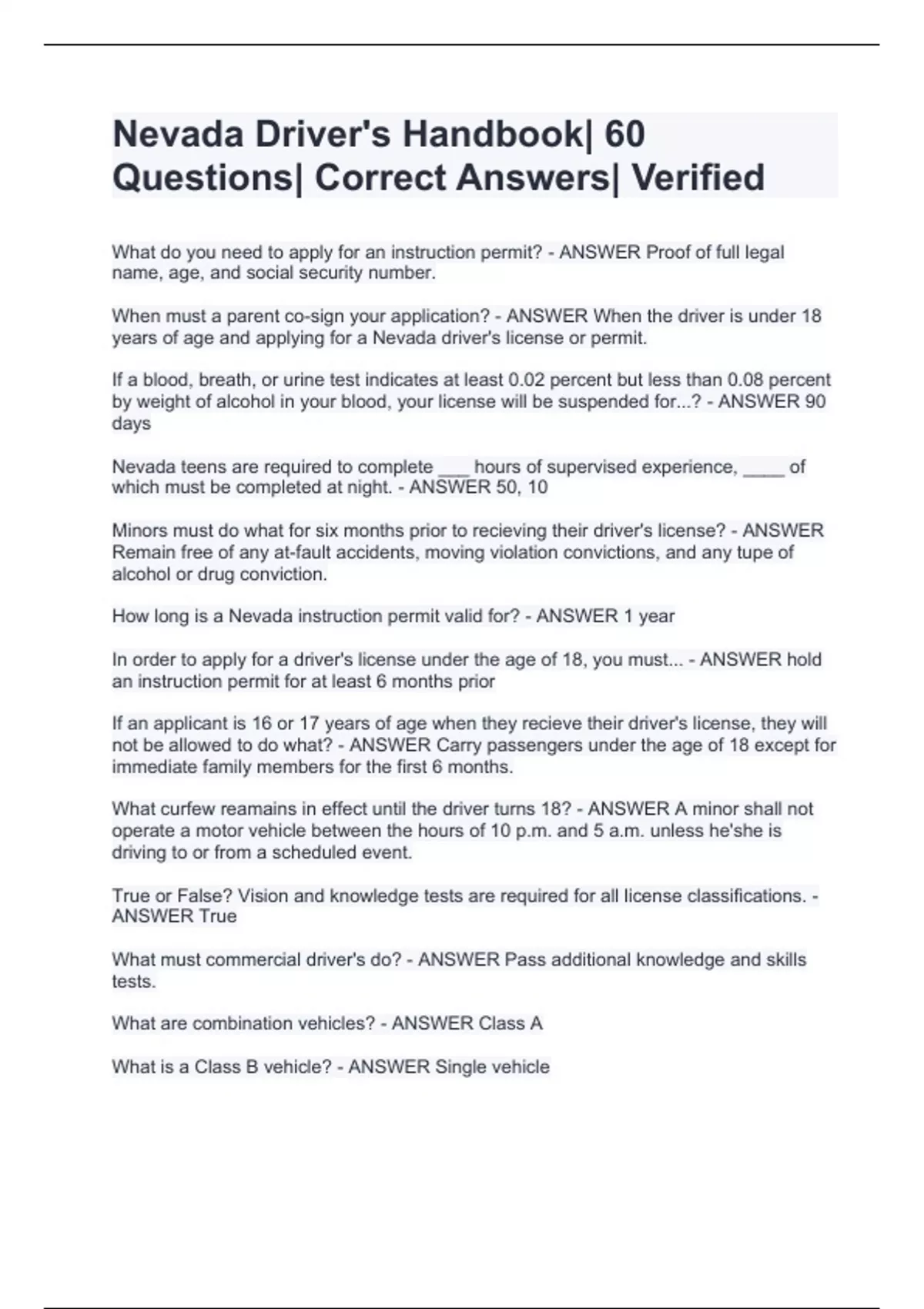 Nevada Driver's Handbook| 60 Questions| Correct Answers| Verified