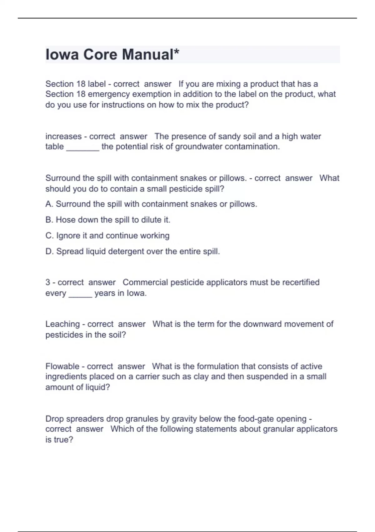 Iowa Core Manual Advanced Test Quiz 2024. Section 18 label - correct answer If you are mixing a product that has a Section 18 emergency exemption in addition to the label on the product, what do you use for instructions on how to mix the product? increases - correct answer The presence of sandy soil and a high water table _______ the potential risk of groundwater contamination. Surround the spill with containment snakes or pillows. - correct answer What should you do to contain a small pesticide spill? A. Surround the spill with containment snakes or pillows. B. Hose down the spill to dilute it. C. Ignore it and continue working D. Spread liquid detergent over the entire spill. 3 - correct answer Commercial pesticide applicators must be recertified every _____ years in Iowa. Leaching - correct answer What is the term for the downward movement of pesticides in the soil? Flowable - correct answer What is the formulation that consists of active ingredients placed on a carrier such as clay and then suspended in a small amount of liquid?