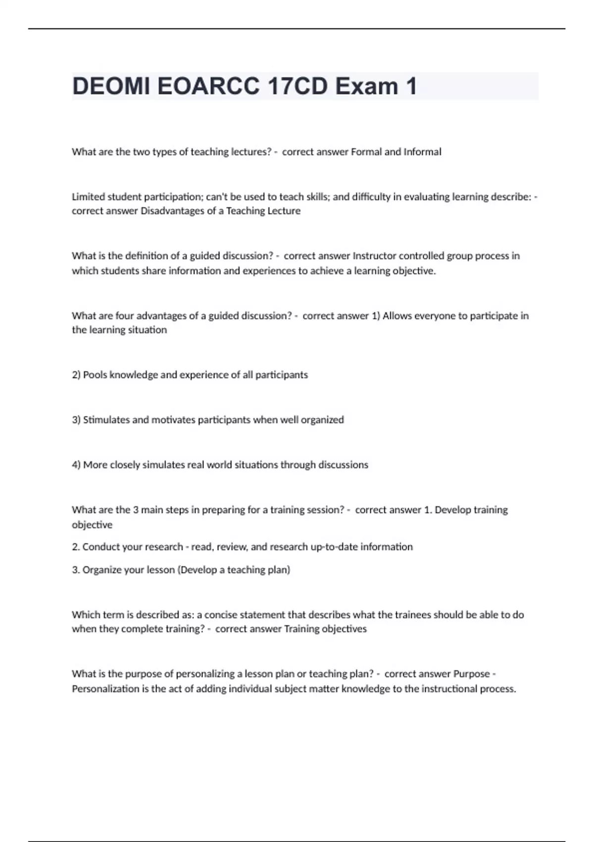 DEOMI EOARCC 17CD Exam 1What are the two types of teaching lectures? - correct answer Formal and Informal Limited student participation; can't be used to teach skills; and difficulty in evaluating learning describe: - correct answer Disadvantages of a Teaching Lecture What is the definition of a guided discussion? - correct answer Instructor controlled group process in which students share information and experiences to achieve a learning objective. What are four advantages of a guided discussion? - correct answer 1) Allows everyone to participate in the learning situation 2) Pools knowledge and experience of all participants 3) Stimulates and motivates participants when well organized 4) More closely simulates real world situations through discussions What are the 3 main steps in preparing for a training session? - correct answer 1. Develop training objective 2. Conduct your research - read, review, and research up-to-date information 3. Organize your lesson (Develop a teaching plan) Which term is described as: a concise statement that describes what the trainees should be able to do when they complete training? - correct answer Training objectives What is the purpose of personalizing a lesson plan or teaching plan? - correct answer Purpose - Personalization is the act of adding individual subject matter knowledge to the instructional process.