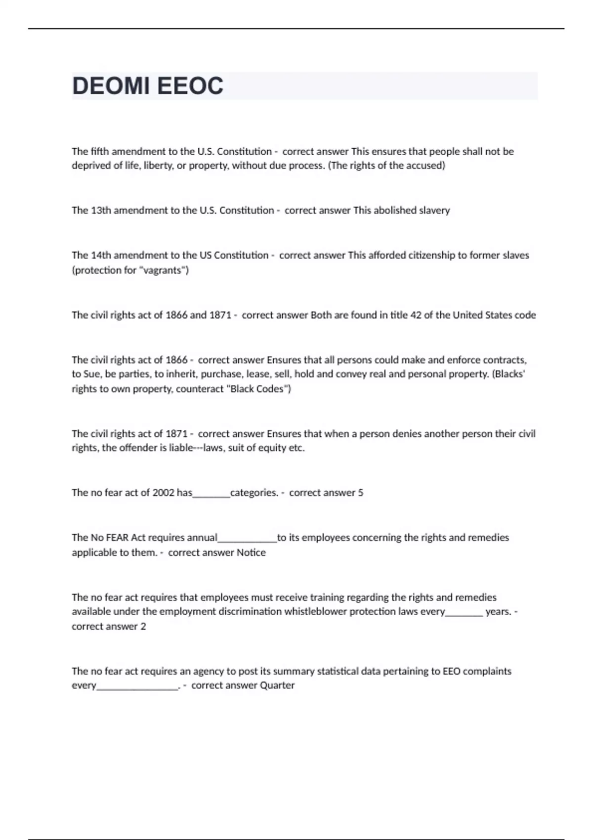 DEOMI EEOC The fifth amendment to the U.S. Constitution - correct answer This ensures that people shall not be deprived of life, liberty, or property, without due process. (The rights of the accused) The 13th amendment to the U.S. Constitution - correct answer This abolished slavery The 14th amendment to the US Constitution - correct answer This afforded citizenship to former slaves (protection for "vagrants") The civil rights act of 1866 and 1871 - correct answer Both are found in title 42 of the United States code The civil rights act of 1866 - correct answer Ensures that all persons could make and enforce contracts, to Sue, be parties, to inherit, purchase, lease, sell, hold and convey real and personal property. (Blacks' rights to own property, counteract "Black Codes") The civil rights act of 1871 - correct answer Ensures that when a person denies another person their civil rights, the offender is liable---laws, suit of equity etc. The no fear act of 2002 has_______categories. - correct answer 5 The No FEAR Act requires annual___________to its employees concerning the rights and remedies applicable to them. - correct answer Notice The no fear act requires that employees must receive training regarding the rights and remedies available under the employment discrimination whistleblower protection laws every_______ years. - correct answer 2 The no fear act requires an agency to post its summary statistical data pertaining to EEO complaints every_______________. - correct answer Quarter