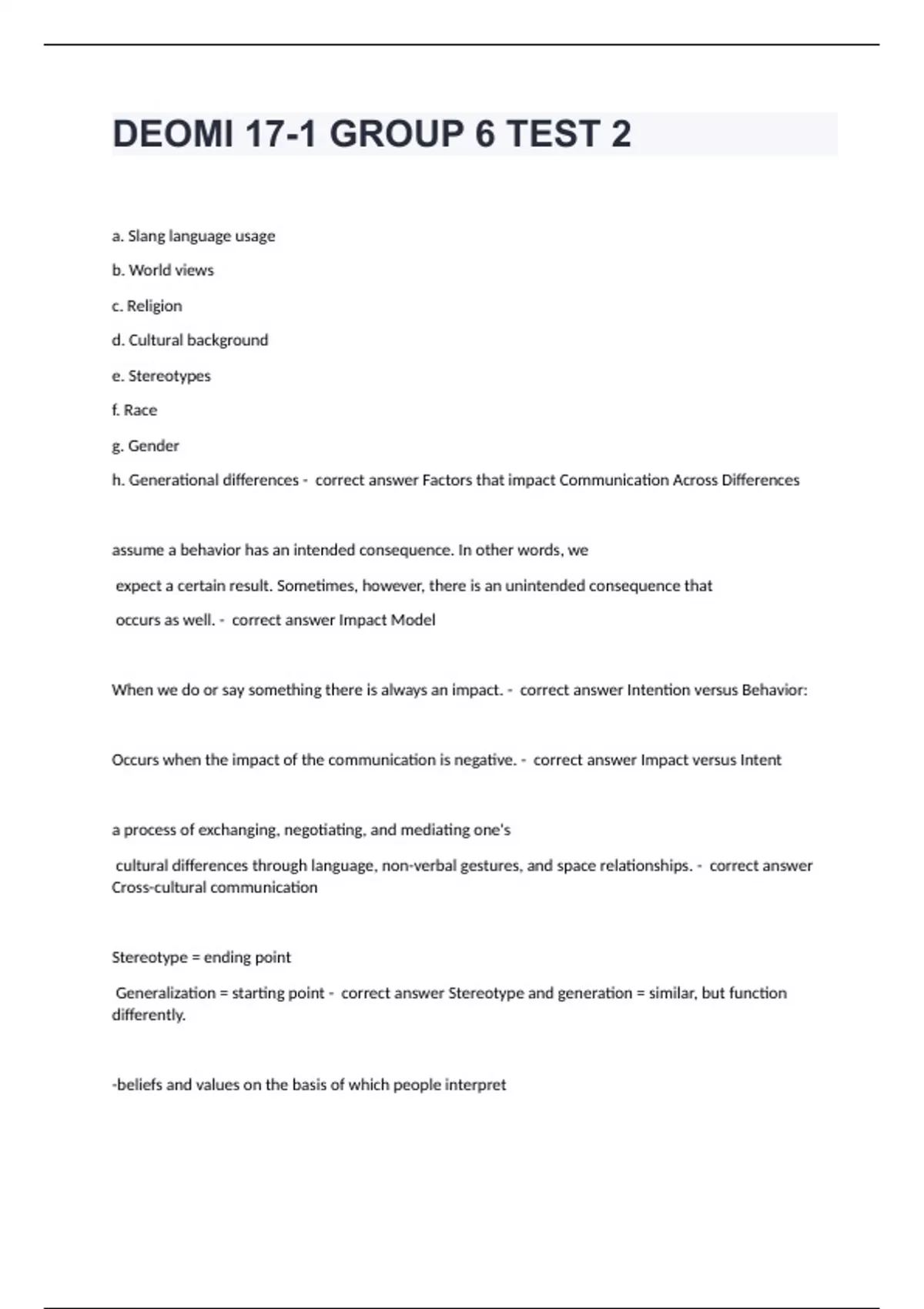 DEOMI 17-1 GROUP 6 TEST 2a. Slang language usage b. World views c. Religion d. Cultural background e. Stereotypes f. Race g. Gender h. Generational differences - correct answer Factors that impact Communication Across Differences assume a behavior has an intended consequence. In other words, we expect a certain result. Sometimes, however, there is an unintended consequence that occurs as well. - correct answer Impact Model When we do or say something there is always an impact. - correct answer Intention versus Behavior: Occurs when the impact of the communication is negative. - correct answer Impact versus Intent a process of exchanging, negotiating, and mediating one's cultural differences through language, non-verbal gestures, and space relationships. - correct answer Cross-cultural communication Stereotype = ending point Generalization = starting point - correct answer Stereotype and generation = similar, but function differently. -beliefs and values on the basis of which people interpret experiences and behave individually and in groups. -often at the root of communication challenges. -what we see, how we make sense of what we see, and how we express ourselves. - correct answer Culture What are based on unique a) perspectives, b) practices, c) products. - correct answer Cross-Cultural differences a. Personal Space b. Eye Contact c. Speaking Volume d. Touch e. Smiling f. Facial Control g. Time h. Silence i. Agreement - correct answer Cultural Tendencies - refers to the attitudes, feelings, and behaviors that a given culture associates with a person's biological sex. - correct answer Definition of Gender - refers to a person's biological status and is typically categorized as male, female, or intersex - correct answer Definition of Sex -Gender communication differences begin during childhood. - Communication behaviors that are prominent among girls may not be for boys and vice versa. - correct answer Childhood Gender Communication