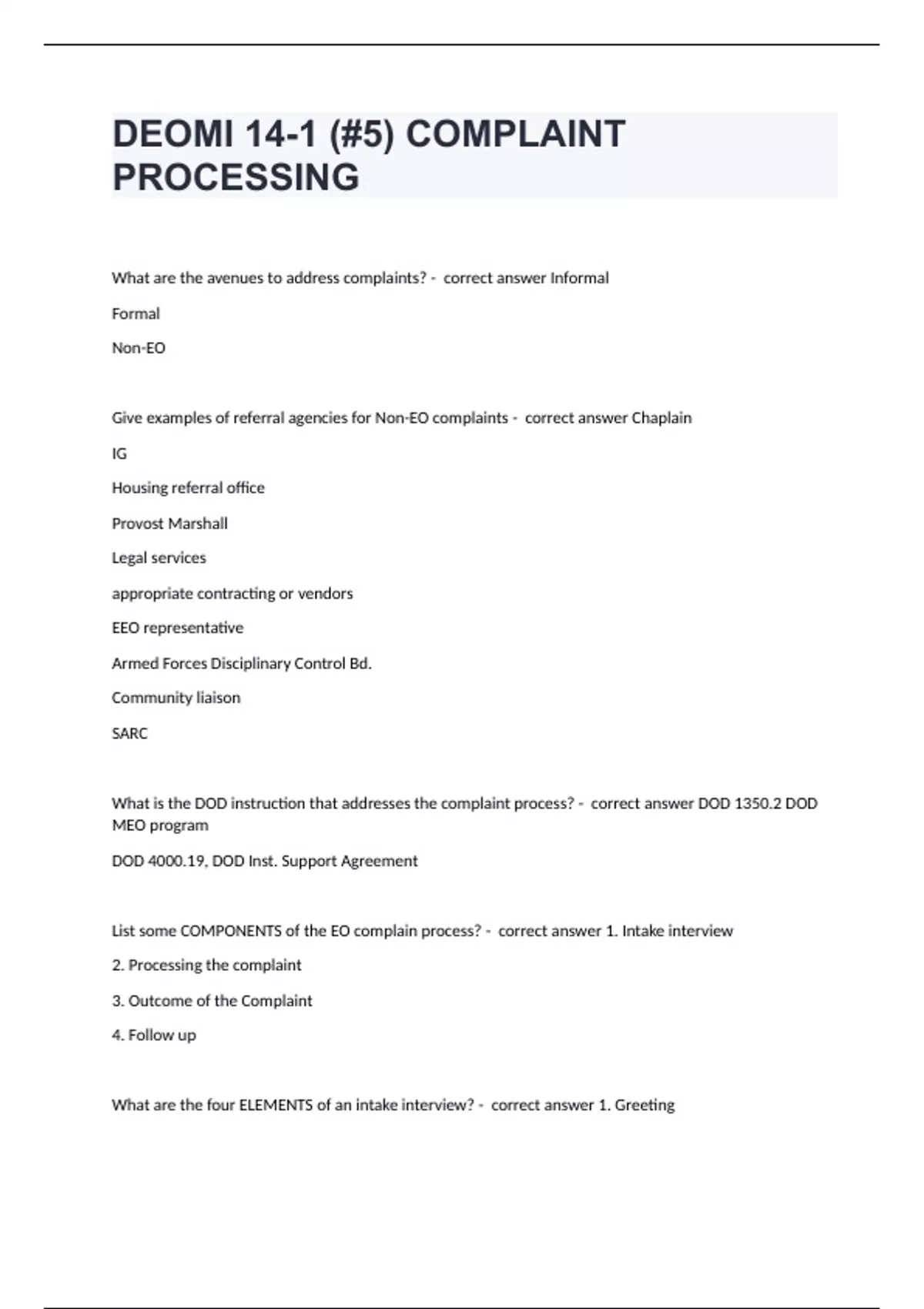 DEOMI 14-1 (#5) COMPLAINT PROCESSINGWhat are the avenues to address complaints? - correct answer Informal Formal Non-EO Give examples of referral agencies for Non-EO complaints - correct answer Chaplain IG Housing referral office Provost Marshall Legal services appropriate contracting or vendors EEO representative Armed Forces Disciplinary Control Bd. Community liaison SARC What is the DOD instruction that addresses the complaint process? - correct answer DOD 1350.2 DOD MEO program DOD 4000.19, DOD Inst. Support Agreement List some COMPONENTS of the EO complain process? - correct answer 1. Intake interview 2. Processing the complaint 3. Outcome of the Complaint 4. Follow up What are the four ELEMENTS of an intake interview? - correct answer 1. Greeting 2. Body 3. Closing 4. Follow-up What tasks will EOA's perform in order to process the report? - correct answer 1. Initial reporting/Notification 2. Interim reporting 3. Monitoring What must an EOA monitor during the report processing? - correct answer 1. Timelines 2. Administrative procedures 3. Victim focus and reprisal What is the definition of Victim Focus? - correct answer The tendency to see the complainant as the problem instead of searching for the root cause of the issue. What is a threat to take unfavorable personnel action, withholding or threatening to withhold a favorable personnel action. Or any act of retaliation against a complainant? - correct answer Definition of Reprisal What are the two outcomes of a complaint? - correct answer Substantiated and Unsubstantiated What items are involved when an EOA follows up on the complaint? - correct answer Branch dependent 1. Interviews 2. Observations 3. Documentation 4. Final Report 5. Archive the complaint 6. Data entry 1. Establishing rapport with interviewee