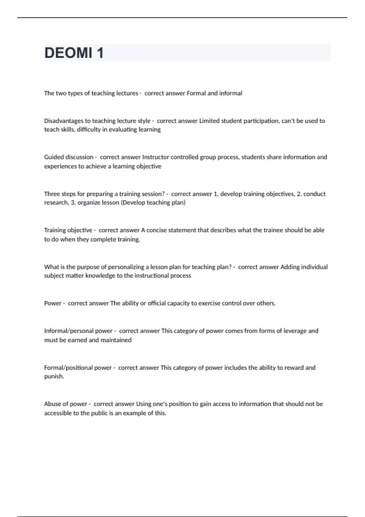 DEOMI 1The two types of teaching lectures - correct answer Formal and informal Disadvantages to teaching lecture style - correct answer Limited student participation, can't be used to teach skills, difficulty in evaluating learning Guided discussion - correct answer Instructor controlled group process, students share information and experiences to achieve a learning objective Three steps for preparing a training session? - correct answer 1. develop training objectives, 2. conduct research, 3. organize lesson (Develop teaching plan) Training objective - correct answer A concise statement that describes what the trainee should be able to do when they complete training. What is the purpose of personalizing a lesson plan for teaching plan? - correct answer Adding individual subject matter knowledge to the instructional process Power - correct answer The ability or official capacity to exercise control over others. Informal/personal power - correct answer This category of power comes from forms of leverage and must be earned and maintained Formal/positional power - correct answer This category of power includes the ability to reward and punish. Abuse of power - correct answer Using one's position to gain access to information that should not be accessible to the public is an example of this. Privilege - correct answer A special advantage, immunity, permission, right, or benefit granted to or enjoyed by an individual people, class, or cast Social dominance theory - correct answer Proposes that societies contain ideologies that either promote or attenuate intergroup hierarchies Sexual orientation privilege - correct answer Associated with the marginalization of nonheterosexual lifestyles and the view that heterosexuality is the normal sexual orientation How does being aware of your surroundings help to address the negative affects of power and privilege as an EOA? - correct answer Because you see if you can identify inequality based upon power and privilege, while at work, watching TV, listening to the news, or playing video games. Rationalization - correct answer This privileged philosophy is used when a person present an alternative reason that does not require him or her to explore the roots of injustice with more depth. Prejudice - correct answer An unreasonable negative attitude toward others because of their membership in a particular group. What are the three levels of prejudice? - correct answer Cognitive, and emotional, action oriented What is the definition of unlawful discrimination according to DoD directive 1020.02E? - correct answer Disparate treatment/harassment of an individual or group based on a prohibitive factor contrary to federal law or regulation. The 6 bases of discrimination in DOD directive 1020.02E? (Military) - correct answer Race. Religion. Color. National origin. Sex. Sexual orientation. True or false. Discrimination based on race/color can only occur when the victim and the person who inspected the discrimination are of the same race/color? - correct answer False.
