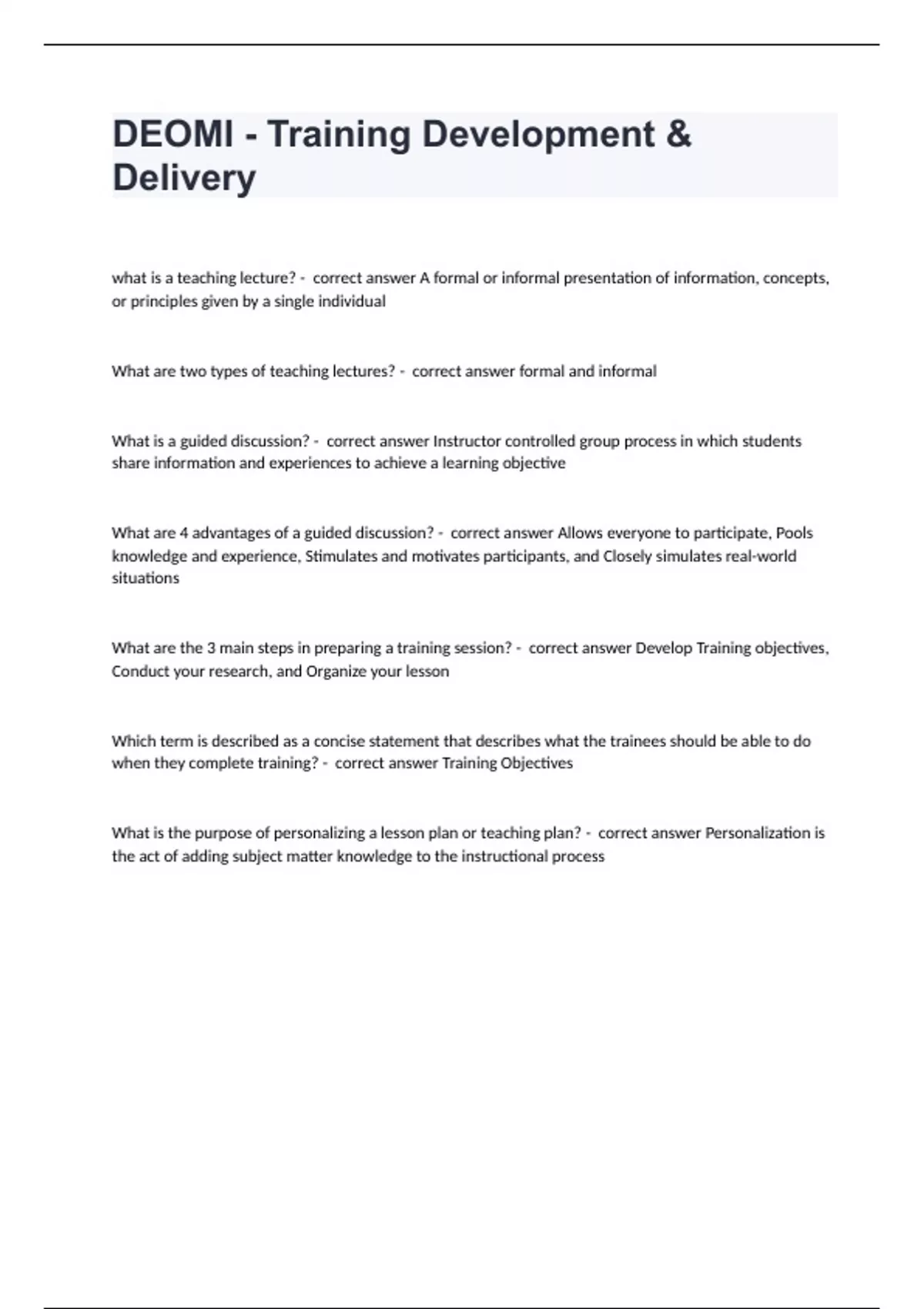 DEOMI - Training Development & Deliverywhat is a teaching lecture? - correct answer A formal or informal presentation of information, concepts, or principles given by a single individual What are two types of teaching lectures? - correct answer formal and informal What is a guided discussion? - correct answer Instructor controlled group process in which students share information and experiences to achieve a learning objective What are 4 advantages of a guided discussion? - correct answer Allows everyone to participate, Pools knowledge and experience, Stimulates and motivates participants, and Closely simulates real-world situations What are the 3 main steps in preparing a training session? - correct answer Develop Training objectives, Conduct your research, and Organize your lesson Which term is described as a concise statement that describes what the trainees should be able to do when they complete training? - correct answer Training Objectives What is the purpose of personalizing a lesson plan or teaching plan? - correct answer Personalization is the act of adding subject matter knowledge to the instructional process