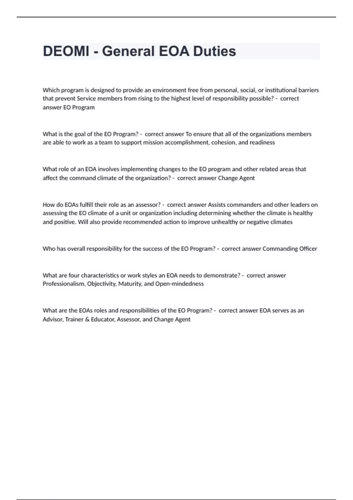 DEOMI - General EOA DutiesWhich program is designed to provide an environment free from personal, social, or institutional barriers that prevent Service members from rising to the highest level of responsibility possible? - correct answer EO Program What is the goal of the EO Program? - correct answer To ensure that all of the organizations members are able to work as a team to support mission accomplishment, cohesion, and readiness What role of an EOA involves implementing changes to the EO program and other related areas that affect the command climate of the organization? - correct answer Change Agent How do EOAs fulfill their role as an assessor? - correct answer Assists commanders and other leaders on assessing the EO climate of a unit or organization including determining whether the climate is healthy and positive. Will also provide recommended action to improve unhealthy or negative climates Who has overall responsibility for the success of the EO Program? - correct answer Commanding Officer What are four characteristics or work styles an EOA needs to demonstrate? - correct answer Professionalism, Objectivity, Maturity, and Open-mindedness What are the EOAs roles and responsibilities of the EO Program? - correct answer EOA serves as an Advisor, Trainer & Educator, Assessor, and Change Agent