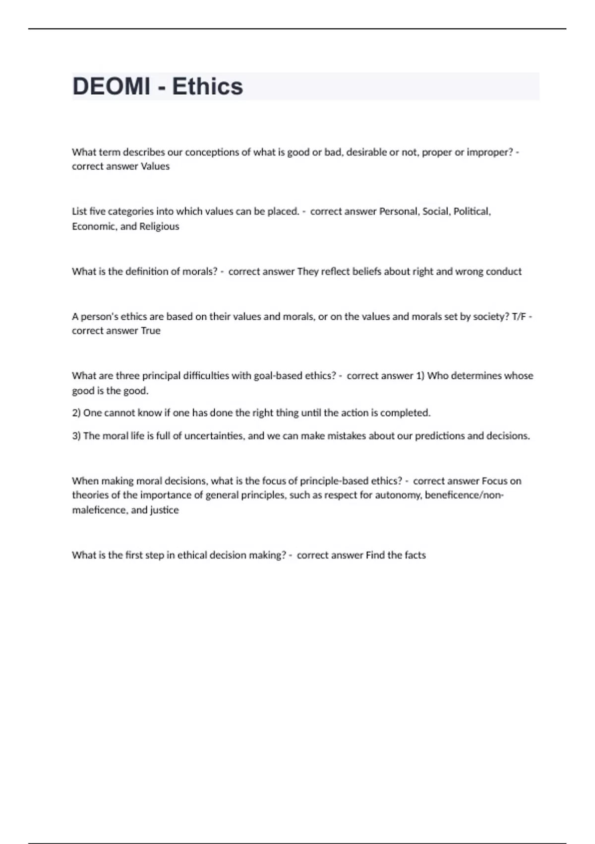 DEOMI - EthicsWhat term describes our conceptions of what is good or bad, desirable or not, proper or improper? - correct answer Values List five categories into which values can be placed. - correct answer Personal, Social, Political, Economic, and Religious What is the definition of morals? - correct answer They reflect beliefs about right and wrong conduct A person's ethics are based on their values and morals, or on the values and morals set by society? T/F - correct answer True What are three principal difficulties with goal-based ethics? - correct answer 1) Who determines whose good is the good. 2) One cannot know if one has done the right thing until the action is completed. 3) The moral life is full of uncertainties, and we can make mistakes about our predictions and decisions. When making moral decisions, what is the focus of principle-based ethics? - correct answer Focus on theories of the importance of general principles, such as respect for autonomy, beneficence/non-maleficence, and justice What is the first step in ethical decision making? - correct answer Find the facts