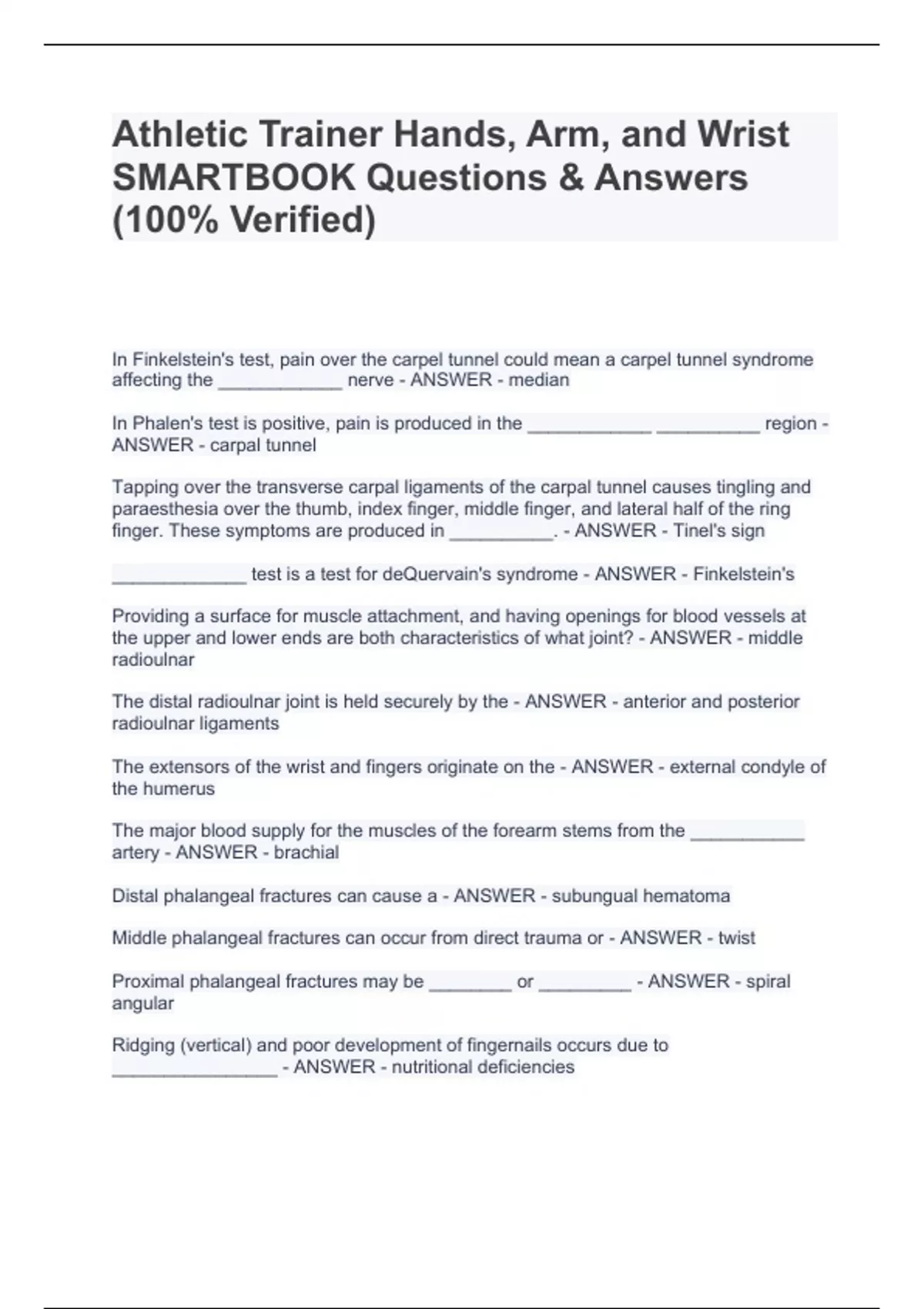 Athletic Trainer Hands, Arm, and Wrist SMARTBOOK Questions & Answers (100% Verified) In Finkelstein's test, pain over the carpel tunnel could mean a carpel tunnel syndrome affecting the ____________ nerve - ANSWER - median In Phalen's test is positive, pain is produced in the ____________ __________ region - ANSWER - carpal tunnel Tapping over the transverse carpal ligaments of the carpal tunnel causes tingling and paraesthesia over the thumb, index finger, middle finger, and lateral half of the ring finger. These symptoms are produced in __________. - ANSWER - Tinel's sign _____________ test is a test for deQuervain's syndrome - ANSWER - Finkelstein's Providing a surface for muscle attachment, and having openings for blood vessels at the upper and lower ends are both characteristics of what joint? - ANSWER - middle radioulnar The distal radioulnar joint is held securely by the - ANSWER - anterior and posterior radioulnar ligaments The extensors of the wrist and fingers originate on the - ANSWER - external condyle of the humerus The major blood supply for the muscles of the forearm stems from the ___________ artery - ANSWER - brachial Distal phalangeal fractures can cause a - ANSWER - subungual hematoma Middle phalangeal fractures can occur from direct trauma or - ANSWER - twist Proximal phalangeal fractures may be ________ or _________ - ANSWER - spiral angular Ridging (vertical) and poor development of fingernails occurs due to ________________ - ANSWER - nutritional deficiencies