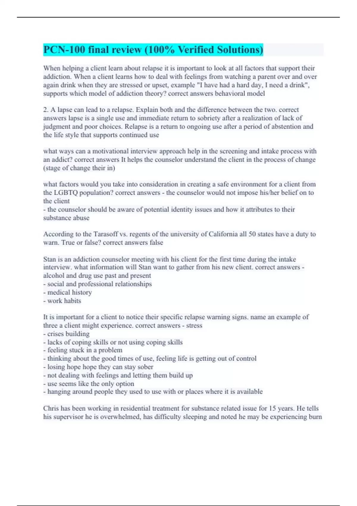 When helping a client learn about relapse it is important to look at all factors that support their addiction. When a client learns how to deal with feelings from watching a parent over and over again drink when they are stressed or upset, example "I have had a hard day, I need a drink", supports which model of addiction theory? correct answers behavioral model 2. A lapse can lead to a relapse. Explain both and the difference between the two. correct answers lapse is a single use and immediate return to sobriety after a realization of lack of judgment and poor choices. Relapse is a return to ongoing use after a period of abstention and the life style that supports continued use what ways can a motivational interview approach help in the screening and intake process with an addict? correct answers It helps the counselor understand the client in the process of change (stage of change their in) what factors would you take into consideration in creating a safe environment for a client from the LGBTQ population? correct answers - the counselor would not impose his/her belief on to the client - the counselor should be aware of potential identity issues and how it attributes to their substance abuse According to the Tarasoff vs. regents of the university of California all 50 states have a duty to warn. True or false? correct answers false Stan is an addiction counselor meeting with his client for the first time during the intake interview. what information will Stan want to gather from his new client. correct answers - alcohol and drug use past and present - social and professional relationships - medical history - work habits It is important for a client to notice their specific relapse warning signs. name an example of three a client might experience. correct answers - stress - crises building - lacks of coping skills or not using coping skills - feeling stuck in a problem - thinking about the good times of use, feeling life is getting out of control - losing hope hope they can stay sober - not dealing with feelings and letting them build up - use seems like the only option - hanging around people they used to use with or places where it is available Chris has been working in residential treatment for substance related issue for 15 years. He tells his supervisor he is overwhelmed, has difficulty sleeping and noted he may be experiencing burn