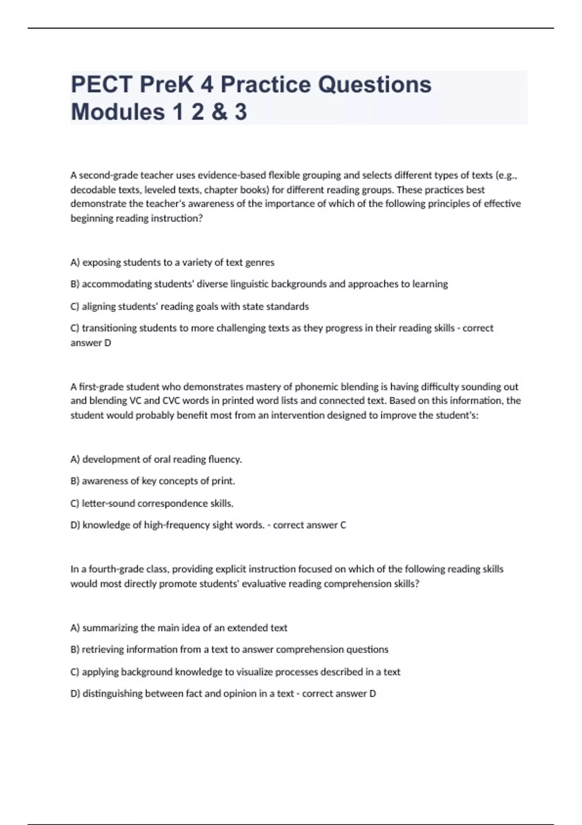 PECT PreK 4 Practice Questions Modules 1 2 & 3 Correctly Answered 2024 A second-grade teacher uses evidence-based flexible grouping and selects different types of texts (e.g., decodable texts, leveled texts, chapter books) for different reading groups. These practices best demonstrate the teacher's awareness of the importance of which of the following principles of effective beginning reading instruction? A) exposing students to a variety of text genres B) accommodating students' diverse linguistic backgrounds and approaches to learning C) aligning students' reading goals with state standards C) transitioning students to more challenging texts as they progress in their reading skills - correct answer D A first-grade student who demonstrates mastery of phonemic blending is having difficulty sounding out and blending VC and CVC words in printed word lists and connected text. Based on this information, the student would probably benefit most from an intervention designed to improve the student's: A) development of oral reading fluency. B) awareness of key concepts of print. C) letter-sound correspondence skills. D) knowledge of high-frequency sight words. - correct answer C In a fourth-grade class, providing explicit instruction focused on which of the following reading skills would most directly promote students' evaluative reading comprehension skills? A) summarizing the main idea of an extended text B) retrieving information from a text to answer comprehension questions C) applying background knowledge to visualize processes described in a text D) distinguishing between fact and opinion in a text - correct answer D .