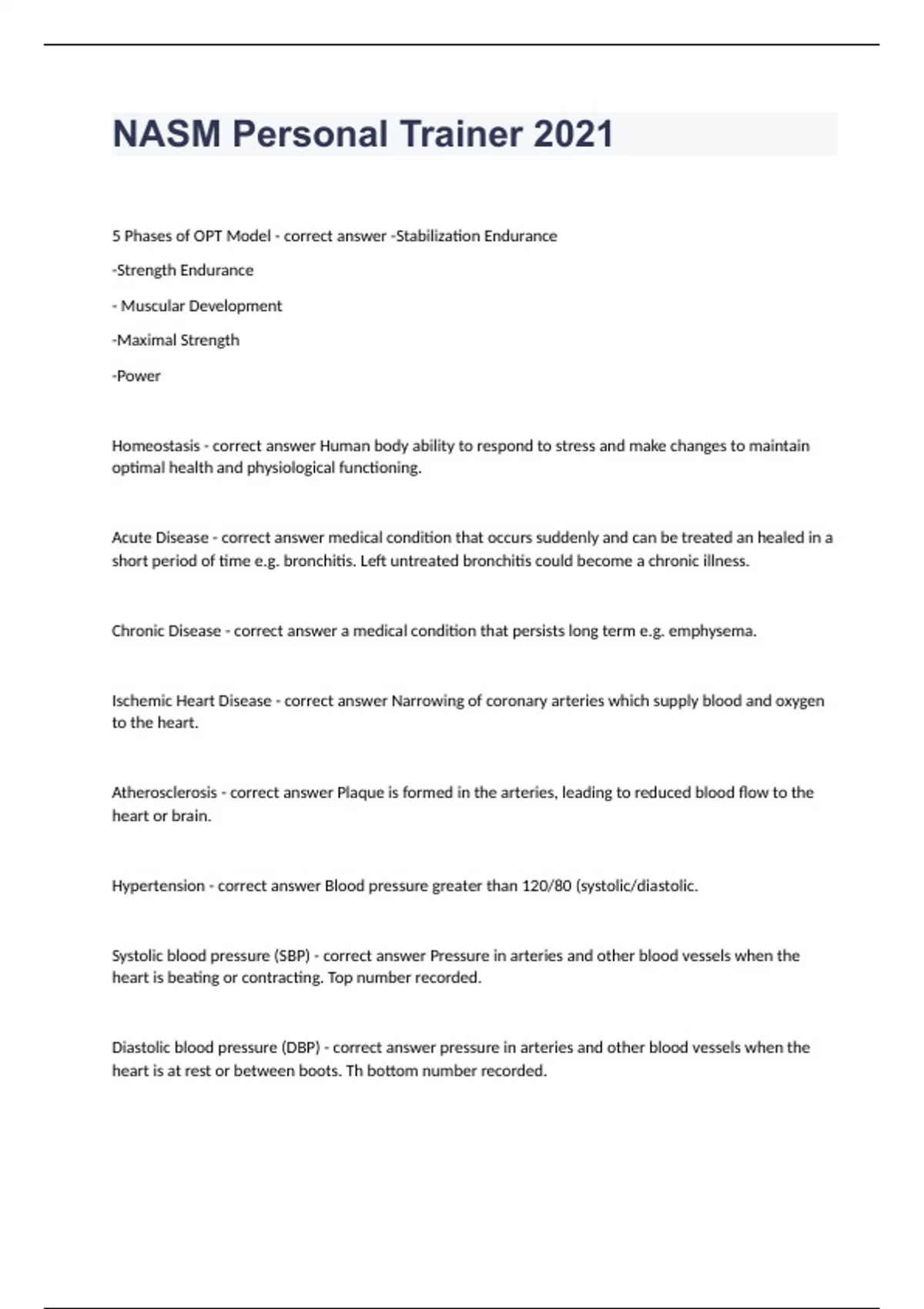 NASM Personal Trainer 2021(UPDATED) Question and answers correctly solved 5 Phases of OPT Model - correct answer -Stabilization Endurance -Strength Endurance - Muscular Development -Maximal Strength -Power Homeostasis - correct answer Human body ability to respond to stress and make changes to maintain optimal health and physiological functioning. Acute Disease - correct answer medical condition that occurs suddenly and can be treated an healed in a short period of time e.g. bronchitis. Left untreated bronchitis could become a chronic illness. Chronic Disease - correct answer a medical condition that persists long term e.g. emphysema. Ischemic Heart Disease - correct answer Narrowing of coronary arteries which supply blood and oxygen to the heart. Atherosclerosis - correct answer Plaque is formed in the arteries, leading to reduced blood flow to the heart or brain. Hypertension - correct answer Blood pressure greater than 120/80 (systolic/diastolic. Systolic blood pressure (SBP) - correct answer Pressure in arteries and other blood vessels when the heart is beating or contracting. Top number recorded. Diastolic blood pressure (DBP) - correct answer pressure in arteries and other blood vessels when the heart is at re