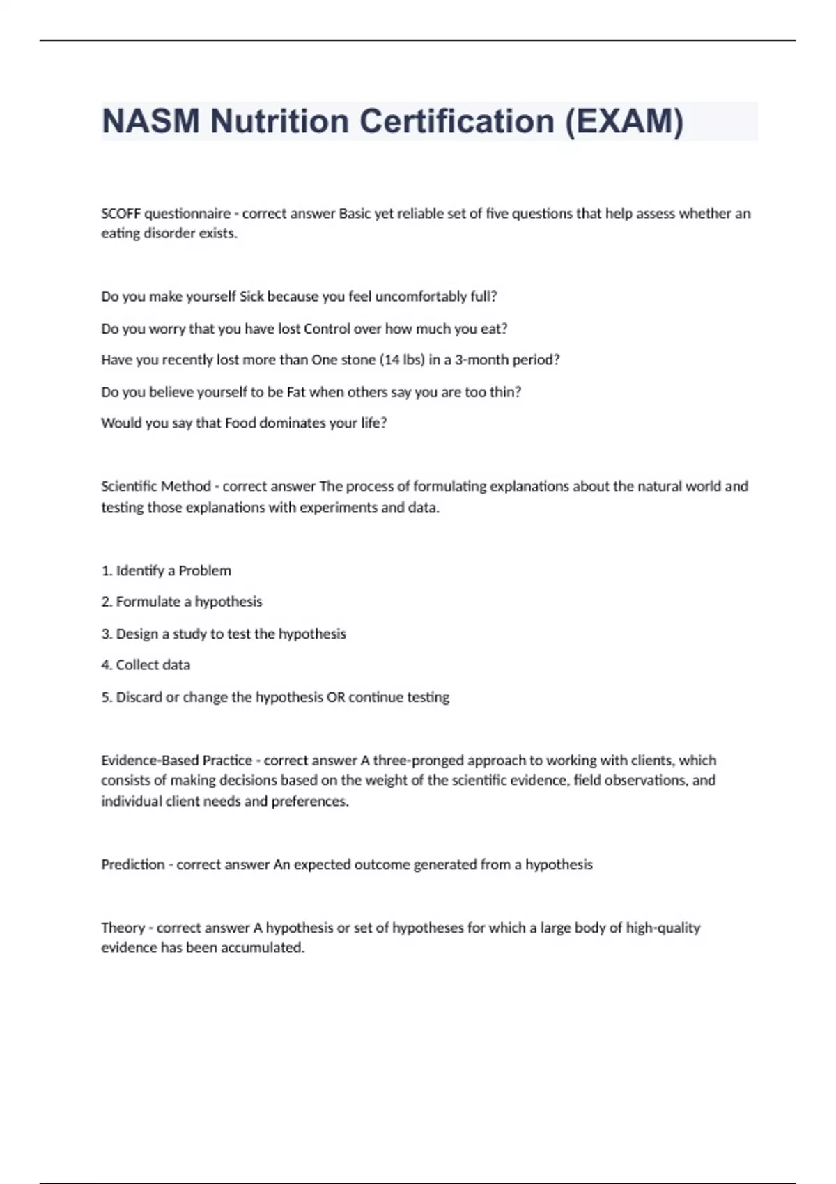 NASM Nutrition Certification (EXAM) Questions with complete solution 2024 SCOFF questionnaire - correct answer Basic yet reliable set of five questions that help assess whether an eating disorder exists. Do you make yourself Sick because you feel uncomfortably full? Do you worry that you have lost Control over how much you eat? Have you recently lost more than One stone (14 lbs) in a 3-month period? Do you believe yourself to be Fat when others say you are too thin? Would you say that Food dominates your life? Scientific Method - correct answer The process of formulating explanations about the natural world and testing those explanations with experiments and data. 1. Identify a Problem 2. Formulate a hypothesis 3. Design a study to test the hypothesis 4. Collect data 5. Discard or change the hypothesis OR continue testing Evidence-Based Practice - correct answer A three-pronged approach to working with clients, which consists of making decisions based on the weight of the scientific evidence, field observations, and individual client needs and preferences. Prediction - correct answer An expected outcome generated from a hypothesis Theory - correct a