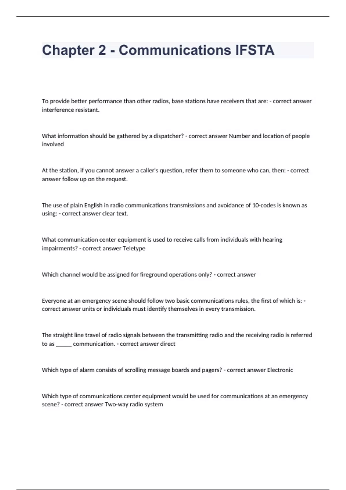 Chapter 2 - Communications IFSTA Final Exam Questions 2024. To provide better performance than other radios, base stations have receivers that are: - correct answer interference resistant. What information should be gathered by a dispatcher? - correct answer Number and location of people involved At the station, if you cannot answer a caller's question, refer them to someone who can, then: - correct answer follow up on the request. The use of plain English in radio communications transmissions and avoidance of 10-codes is known as using: - correct answer clear text. What communication center equipment is used to receive calls from individuals with hearing impairments? - correct answer Teletype Which channel would be assigned for fireground operations only? - correct answer Everyone at an emergency scene should follow two basic communications rules, the first of which is: - correct answer units or individuals must identify themselves in every transmission. The straight line travel of radio signals between the transmitting radio and the receiving radio is referred to as _____ communication. - correct answer direct Which type of alarm consists of scrolling message boards and pagers? - correct answer Electronic Which type of communications center equipment would be used for communications at an emergency scene? - correct answer Two-way radio system