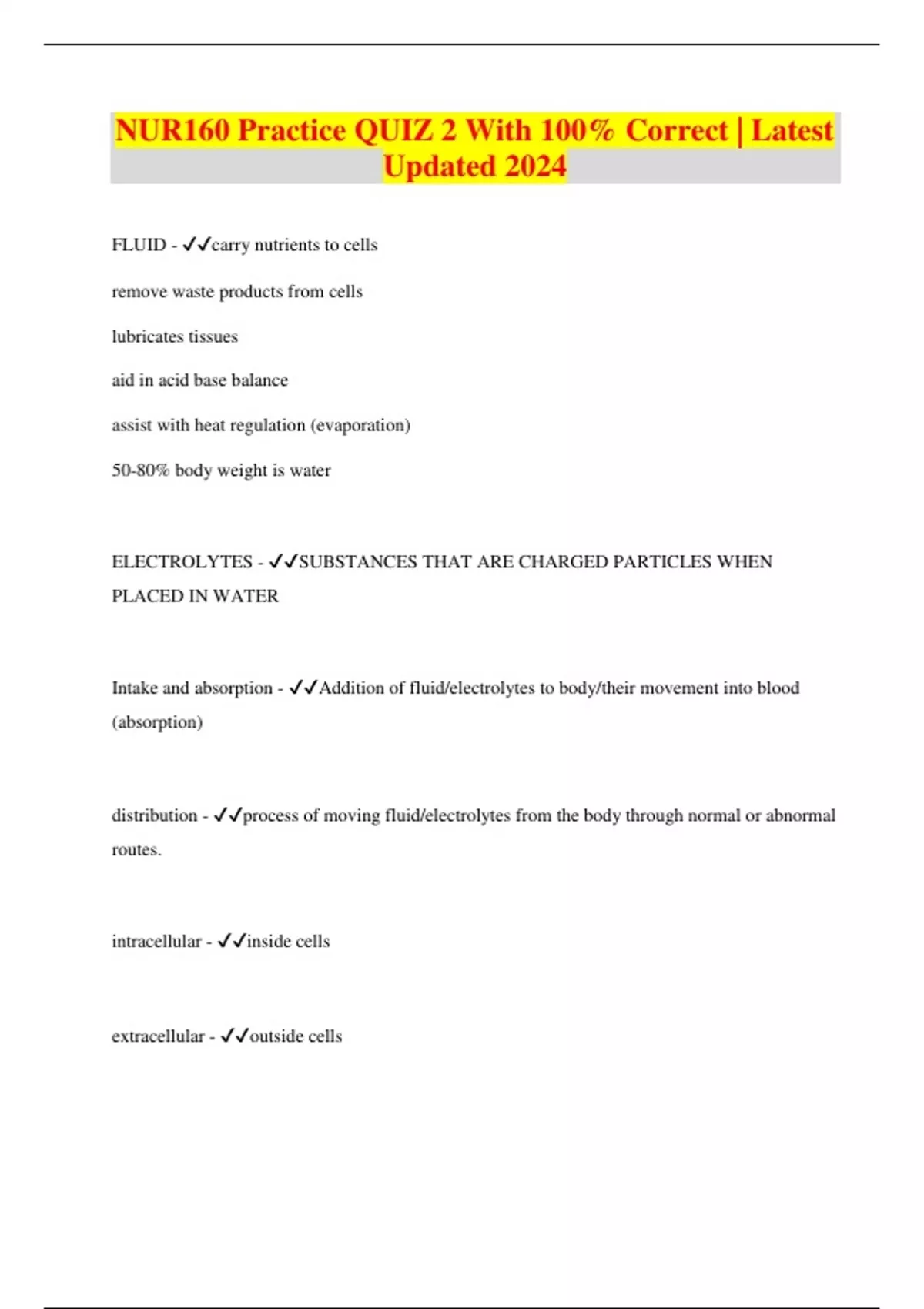 NUR160 Practice QUIZ 2 With 100% Correct | Latest Updated 2024 FLUID - carry nutrients to cells remove waste products from cells lubricates tissues aid in acid base balance assist with heat regulation (evaporation) 50-80% body weight is water ELECTROLYTES - SUBSTANCES THAT ARE CHARGED PARTICLES WHEN PLACED IN WATER Intake and absorption - Addition of fluid/electrolytes to body/their movement into blood (absorption) distribution - process of moving fluid/electrolytes from the body through normal or abnormal routes. intracellular - inside cells extracellular - outside cells