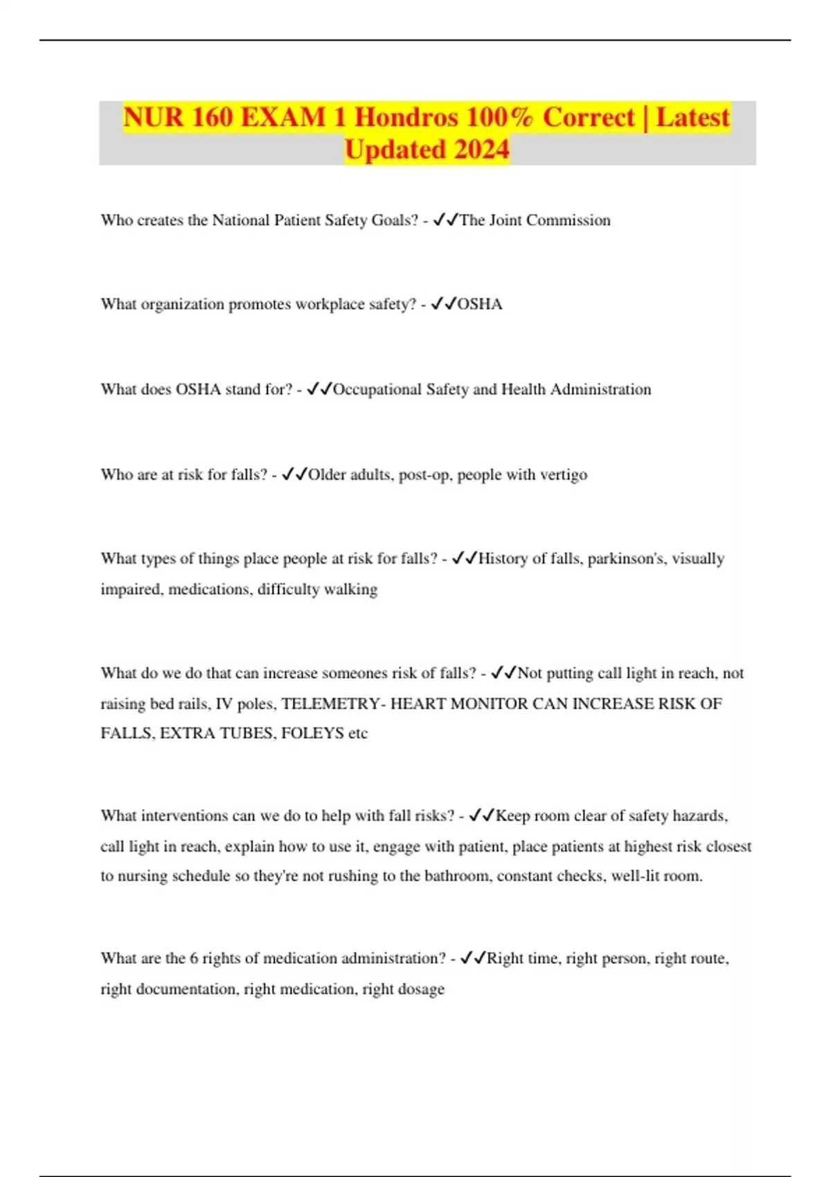 NUR 160 EXAM 1 Hondros 100% Correct | Latest Updated 2024 Who creates the National Patient Safety Goals? - The Joint Commission What organization promotes workplace safety? - OSHA What does OSHA stand for? - Occupational Safety and Health Administration Who are at risk for falls? - Older adults, post-op, people with vertigo What types of things place people at risk for falls? - History of falls, parkinson's, visually impaired, medications, difficulty walking What do we do that can increase someones risk of falls? - Not putting call light in reach, not raising bed rails, IV poles, TELEMETRY- HEART MONITOR CAN INCREASE RISK OF FALLS, EXTRA TUBES, FOLEYS etc What interventions can we do to help with fall risks? - Keep room clear of safety hazards, call light in reach, explain how to use it, engage with patient, place patients at highest risk closest to nursing schedule so they're not rushing to the bathroom, constant checks, well-lit room. What are the 6 rights of medication administration? - Right time, right person, right route, right documentation, right medication, right dosage