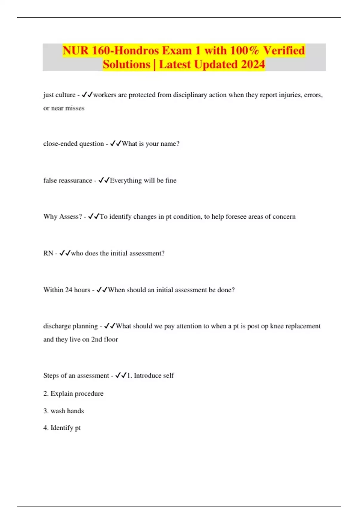 NUR 160-Hondros Exam 1 with 100% Verified Solutions | Latest Updated 2024 just culture - workers are protected from disciplinary action when they report injuries, errors, or near misses close-ended question - What is your name? false reassurance - Everything will be fine Why Assess? - To identify changes in pt condition, to help foresee areas of concern RN - who does the initial assessment? Within 24 hours - When should an initial assessment be done? discharge planning - What should we pay attention to when a pt is post op knee replacement and they live on 2nd floor Steps of an assessment - 1. Introduce self 2. Explain procedure 3. wash hands 4. Identify pt