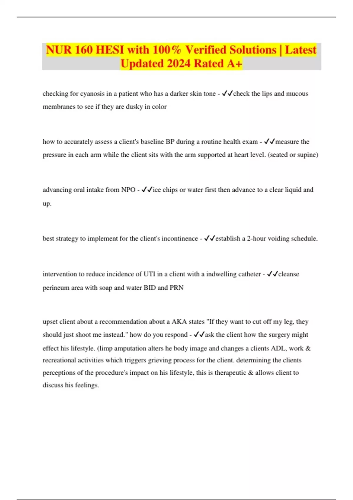 NUR 160 HESI with 100% Verified Solutions | Latest Updated 2024 Rated A+ checking for cyanosis in a patient who has a darker skin tone - check the lips and mucous membranes to see if they are dusky in color how to accurately assess a client's baseline BP during a routine health exam - measure the pressure in each arm while the client sits with the arm supported at heart level. (seated or supine) advancing oral intake from NPO - ice chips or water first then advance to a clear liquid and up. best strategy to implement for the client's incontinence - establish a 2-hour voiding schedule. intervention to reduce incidence of UTI in a client with a indwelling catheter - cleanse perineum area with soap and water BID and PRN upset client about a recommendation about a AKA states "If they want to cut off my leg, they should just shoot me instead." how do you respond - ask the client how the surgery might effect his lifestyle. (limp amputation alters he body image and changes a clients ADL, work & recreational activities which triggers grieving process for the client. determining the clients perceptions of the procedure's impact on his lifestyle, this is therapeutic & allows client to discuss his feelings.